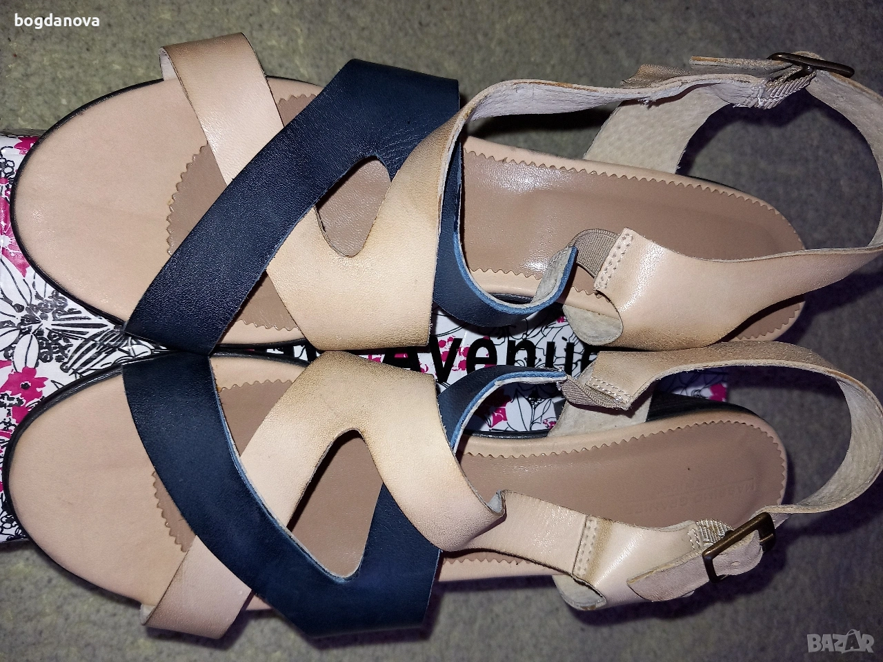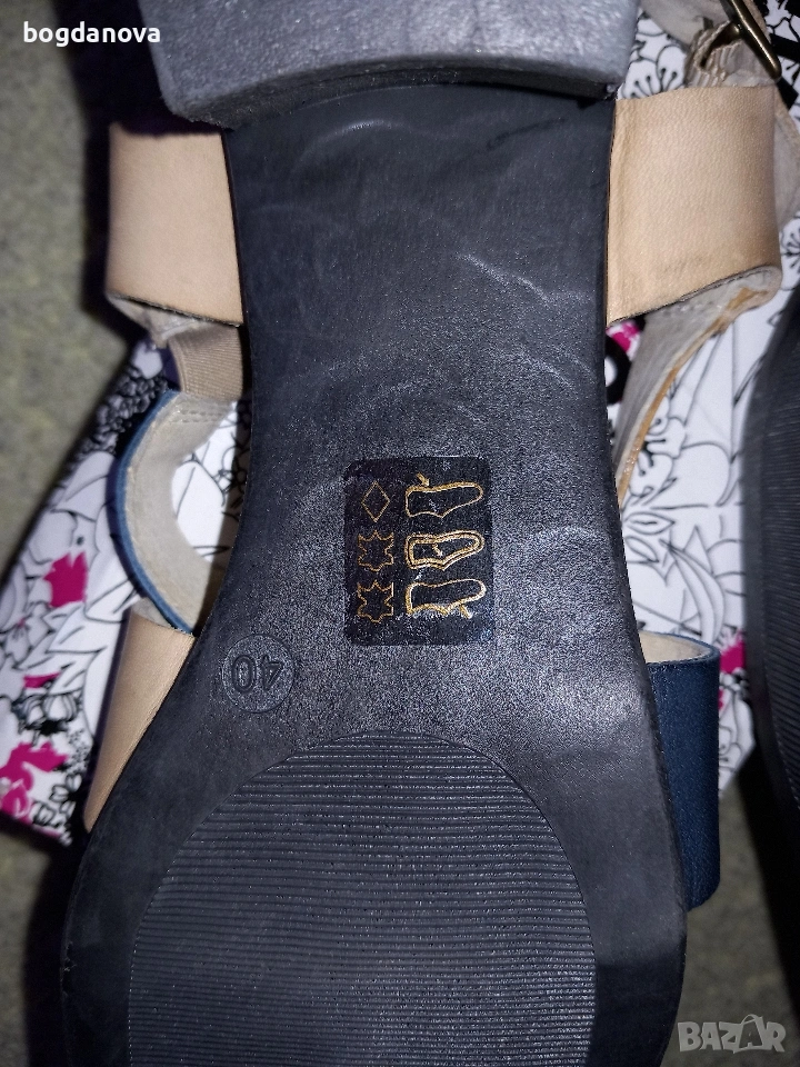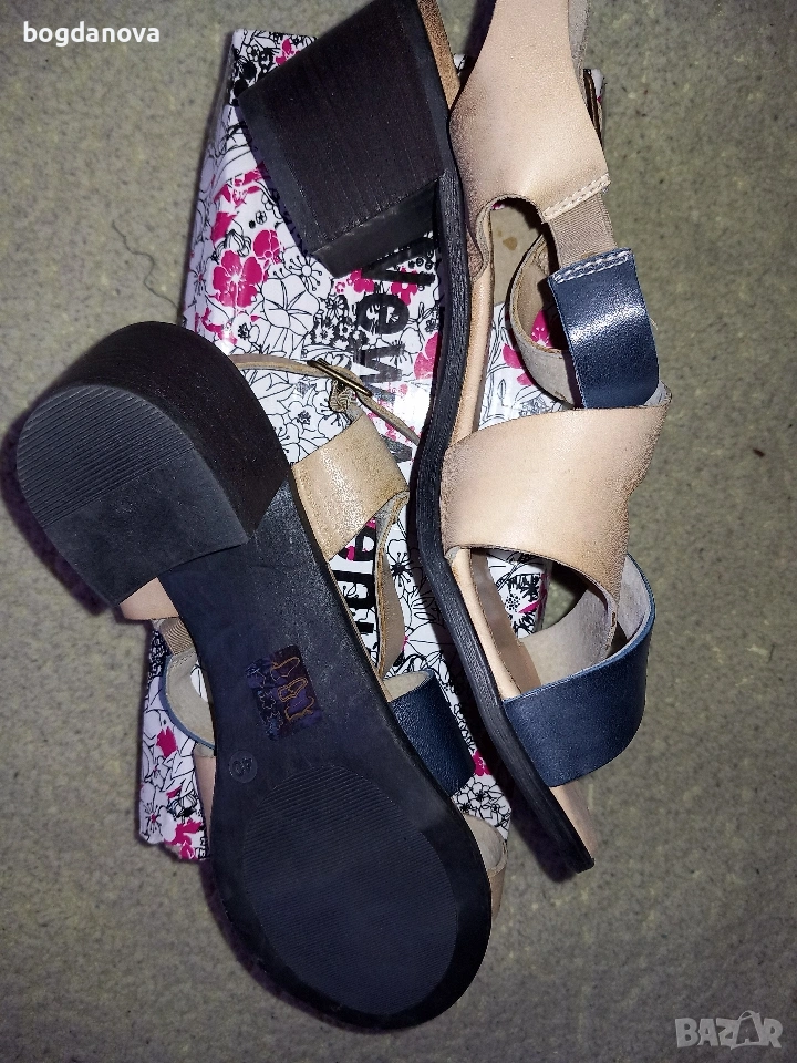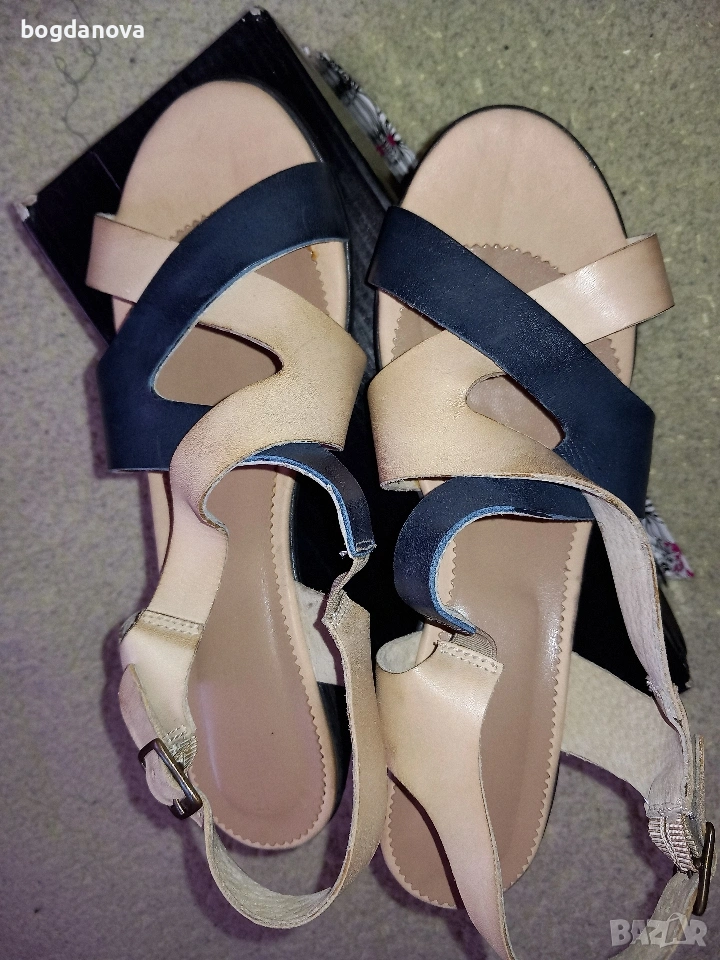 Нови елегантни маркови сандали от естествена кожа, размер 40, в цвят бежов с тъмносин. Стилен избор за лятото! Чисто нови, необувани, без тяхна кутия. Получавате ги с преглед и тест с избран от Вас куриер или с лично предаване. Подходящи са и за по-широк крак, 39 номер.