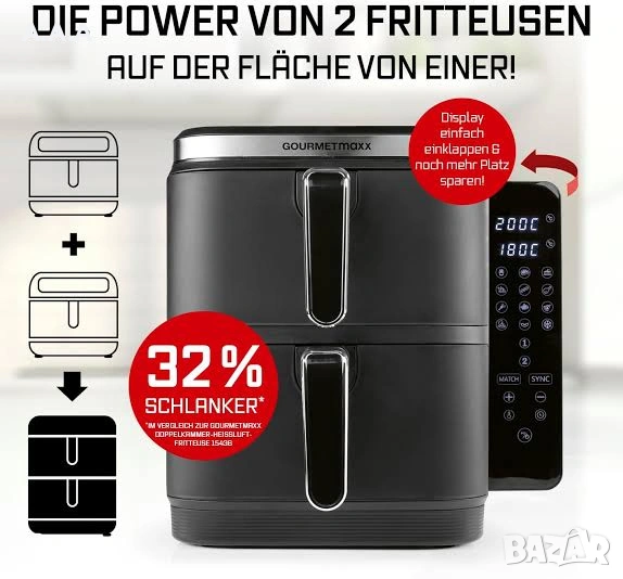 Фритюрник с горещ въздух GourmetMaxx Fryup, вертикален, двойна камера, сгъваем тъчскрийн, капацитет