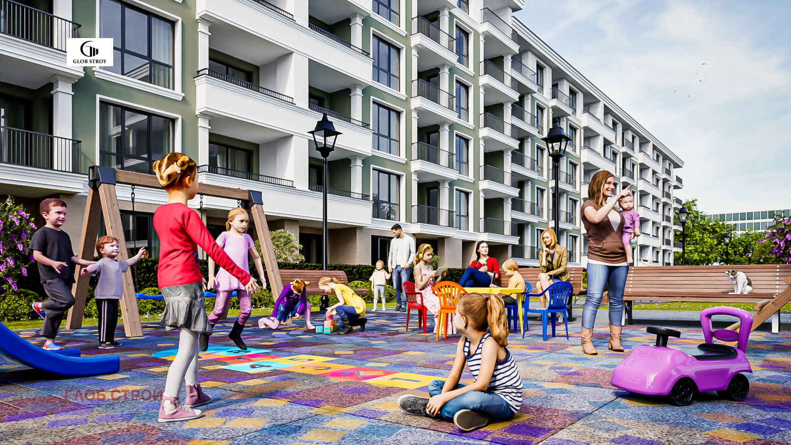 - Пространства за игра и социализация футболно и баскетболно игрище. Вече не е нужно да палите колата, за да заведете детето в парка, той е в комплекса, в контролирана и защитена среда.