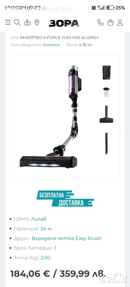 Продавам чисто нова прахосмукачка Rowenta X Force Flex 9.60. Прахосмукачката съдържа турбо четка, и още два накрайника, за тапицерия и трудно достъпни места, има и резервен филтър, само е тествана. Единствения проблем, то се вижда на едната снимка, че при изваждането от кашонът е леко скъсан от едната страна. Купувана е от чужбина, без гаранция, затова е на тази цена. Лек коментар на цената, по договаряне! Изпращам с тест и преглед.
