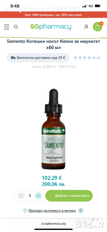 Саменто Котешки нокът са капки със силно антиоксидантно, противовъзпалително, противовирусно и противогъбично действие. Te оказват стимулиращ ефект върху имунната система, като я подсилват и укрепват. Действат, като подпомагат регулирането на кръвното налягане и подобряват физическия тонус на тялото, намалявайки чувството на умора и отпадналост. Предлага се в опаковка от 60 мл.