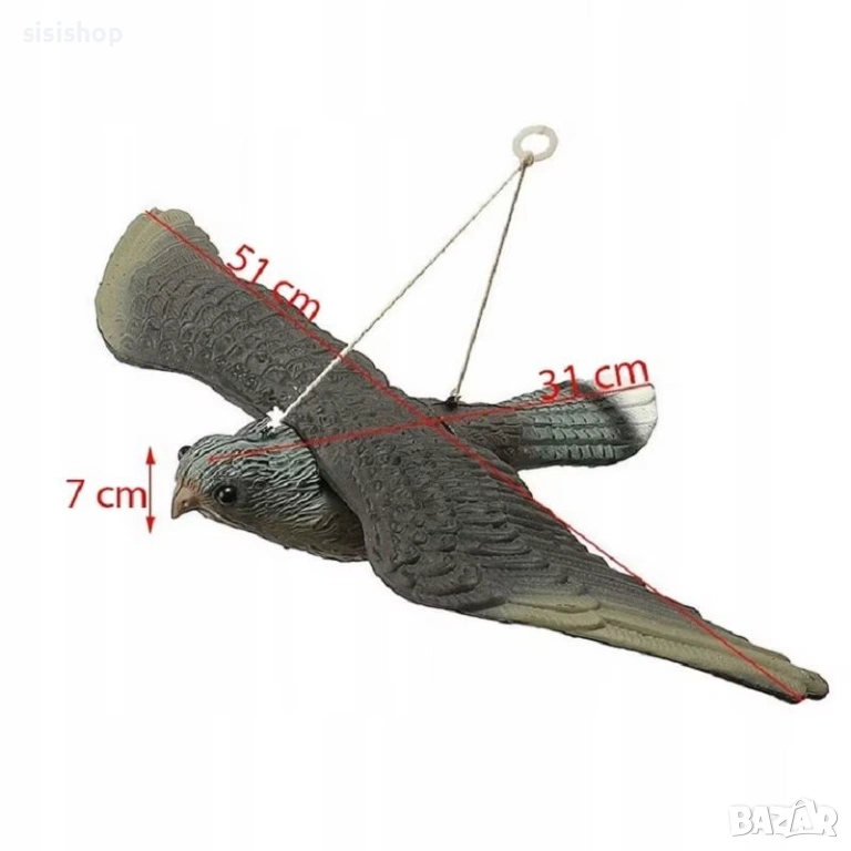 Край на неприятните следи от птици по вашата тераса, парапет или покрив! Нашият реалистичен макет на сокол в полет е доказано средство за градска защита срещу гълъби и врабчета. Системата за окачване позволява на макета да се движи при най-малкия бриз, което създава илюзия за истинска хищна птица, патрулираща над обекта. Моделът е изключително лесен за сглобяване – просто прикрепете крилата към основното тяло и го закачете на проветриво място. Благодарение на олекотената си конструкция и устойчиви материали, соколът е подходящ за целогодишна употреба, като същевременно служи и като интересна екстериорна декорация.