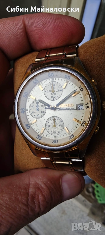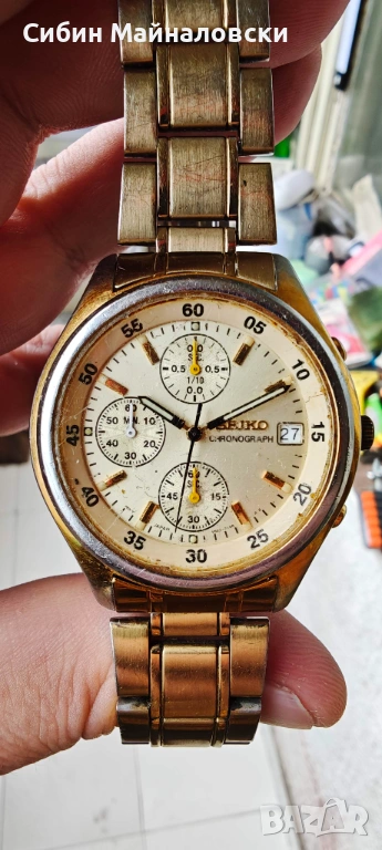 Продавам мъжки часовник Seiko Chronograph Quartz, с нова батерия, напълно функционален, с оригинална верижка, с нормални следи от износване по касата и верижката. Предпочитам лично предаване за гр. София, за страната — Еконт или Спиди с опция преглед и тест. Цена €65.