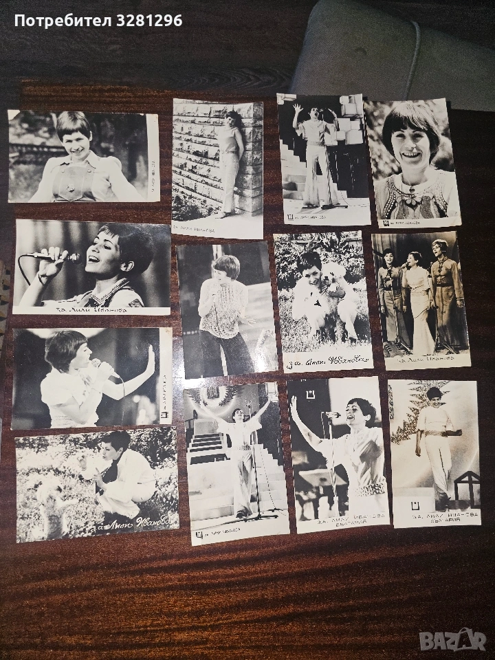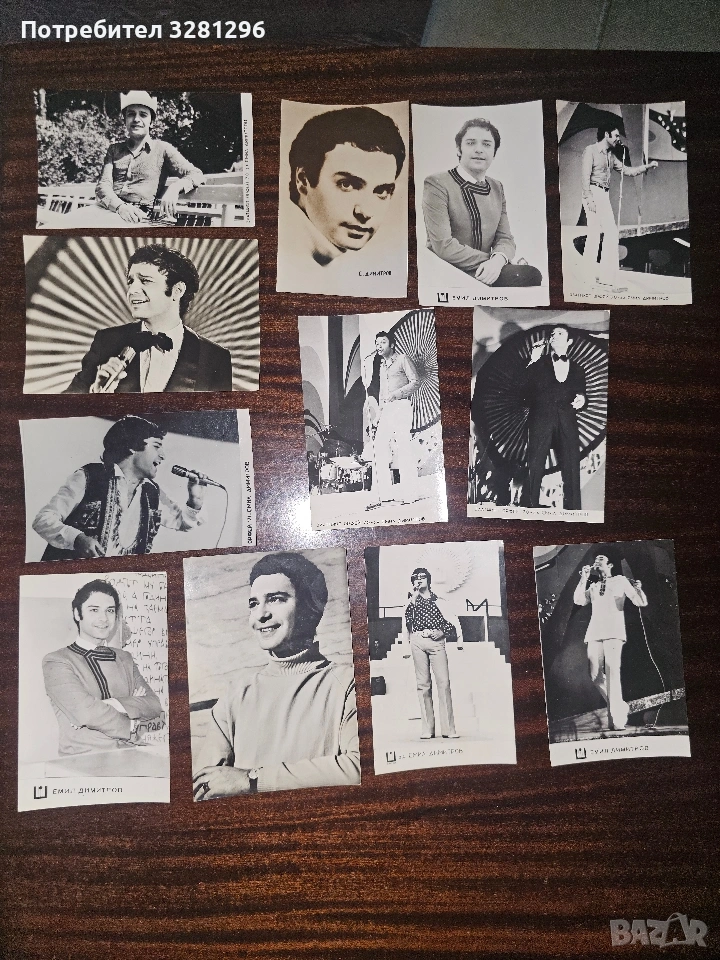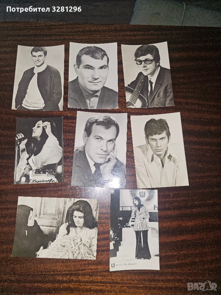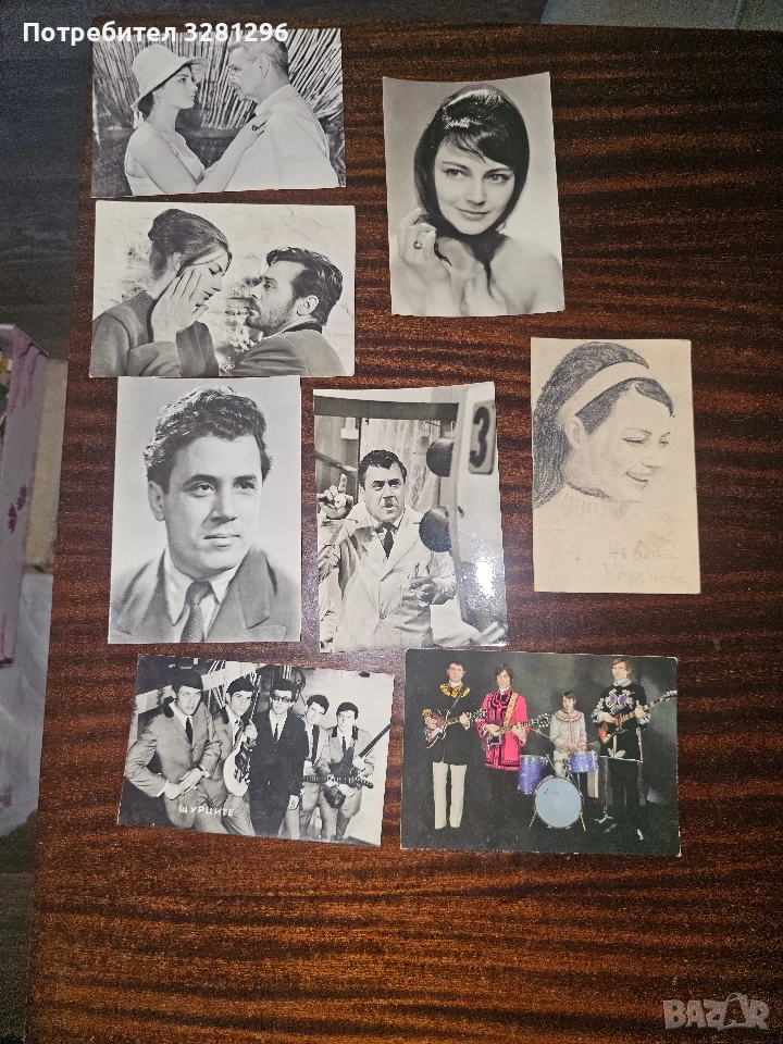 Продавам снимки на ЛилиИванова,Емил Димитров, Бриджит Бардо и др, 48бр всички които се виждат на снимки от 1 до 5 цена за всичко 60евро.Снимки от 6 до 8 поздравителни картичи и снимки от 70-80те години 200бр. цена за всички 25евро.
