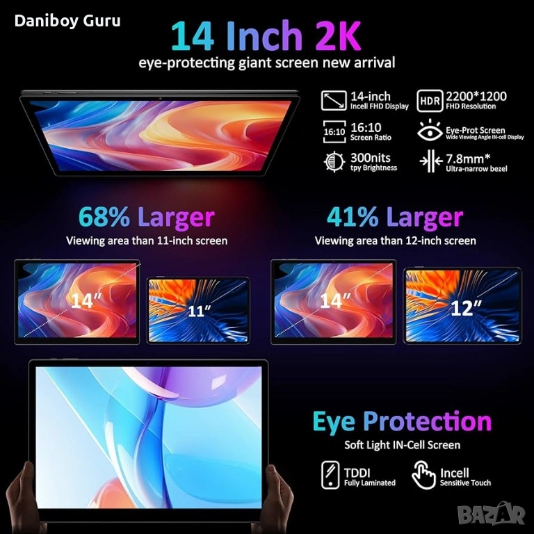 Огромен 14 инча Таблет BEYNIVAN Android 15 36GB RAM 256GB ROM, SIM