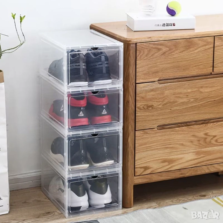 Защитете инвестицията си в качествени обувки с нашия най-издръжлив модел органайзер. Изработена от плътна и здрава пластмаса, тази кутия не се огъва и запазва формата си дори при подреждане в солени колони. Магнитният механизъм на капака гарантира, че вратичката ще остане плътно затворена, спирайки достъпа на прах и влага. Благодарение на широкия си дизайн, тя побира без проблем високи маратонки, официални обувки или боти до размер 46. Изключително лесна за поддръжка и почистване, тя е идеалното решение за дългосрочна организация на вашия дрешник или антре.