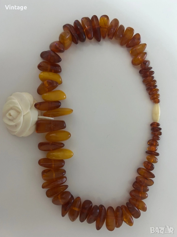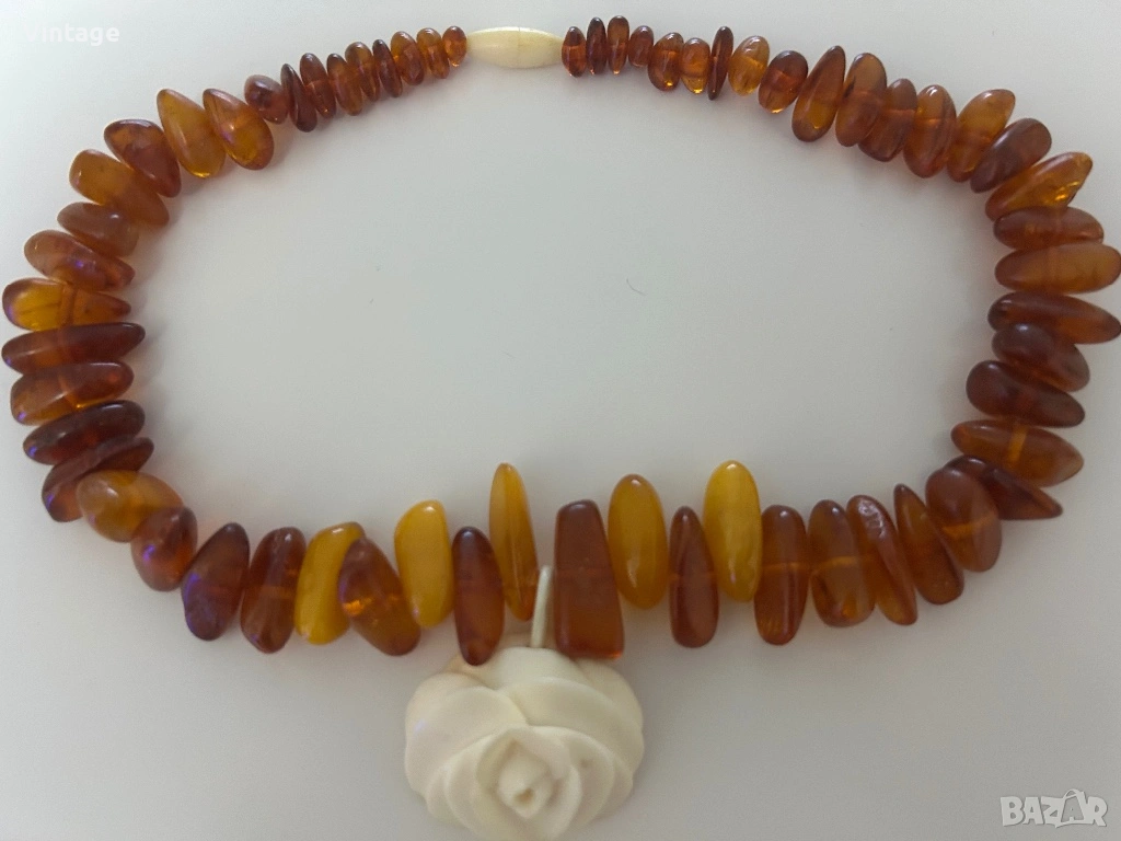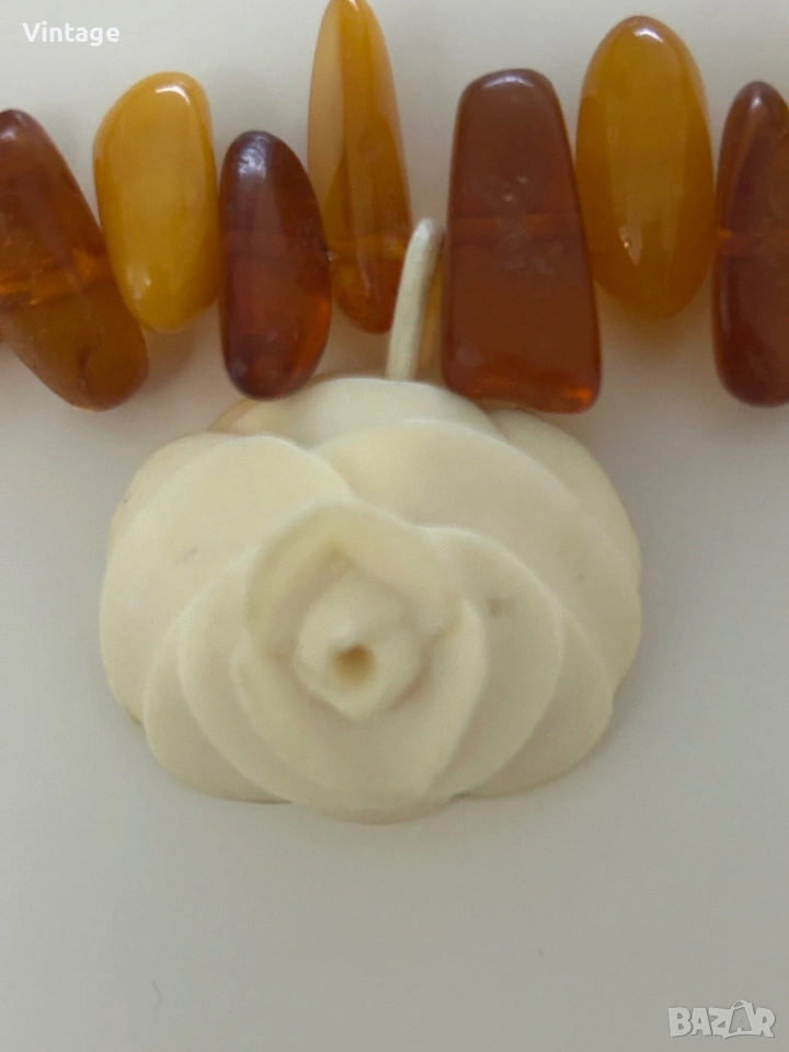 Старинно рядко колие с естествени натурални кехлибари и медальон с роза от истинска слонова кост, закопчалка от слонова кост. Дължина 40см. медальон 3.5см,/ 4см. Много изискан, уникален в отлично състояние.