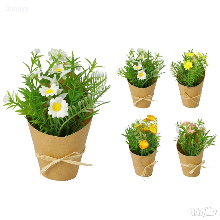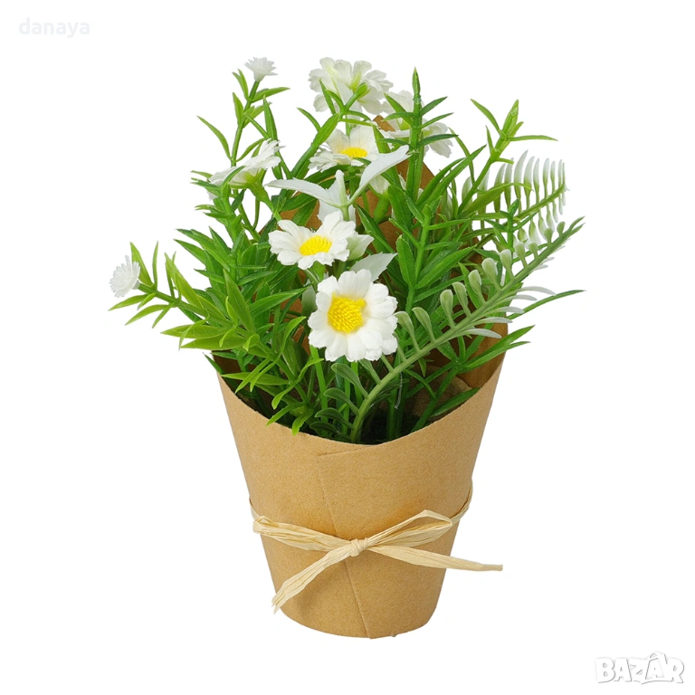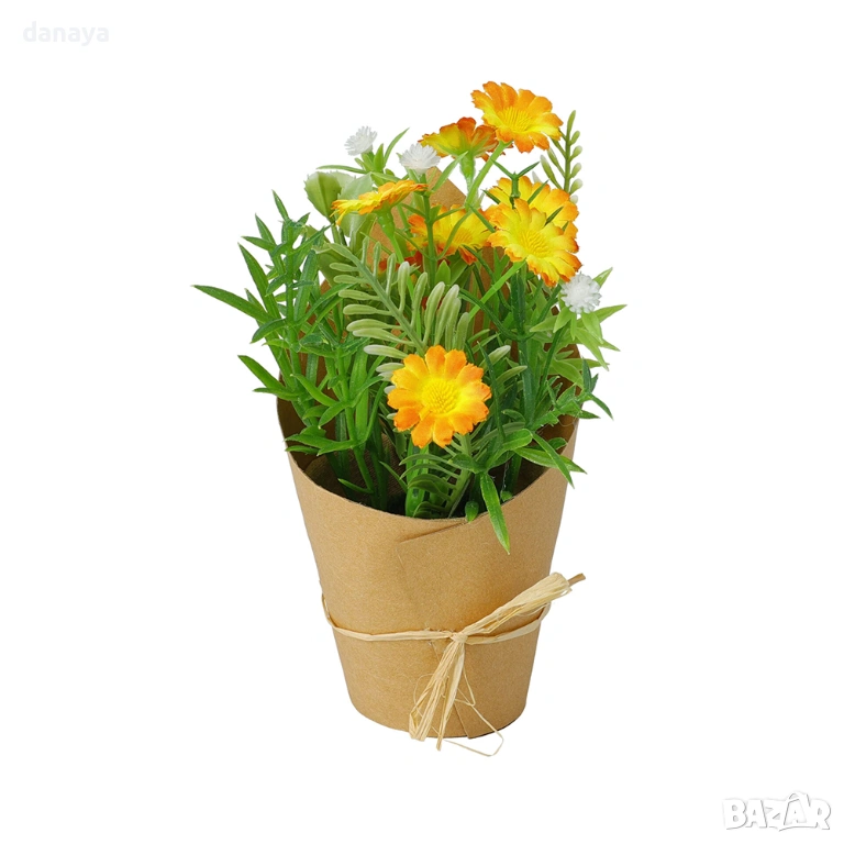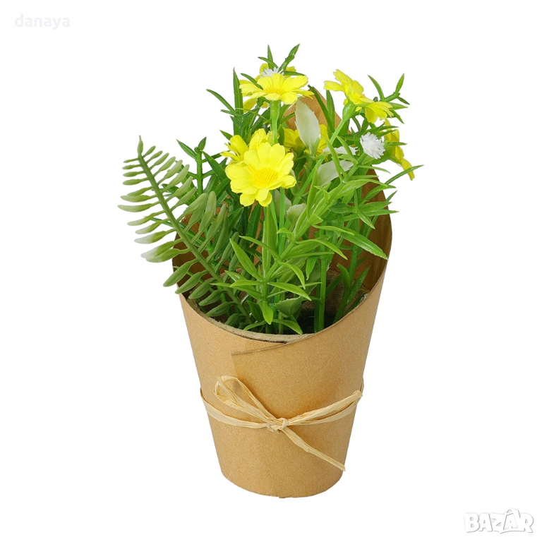 Декоративно цвете в саксия 15 см, изкуствени цветя в картонена саксия, малка декорация за дома, офис или подарък.
