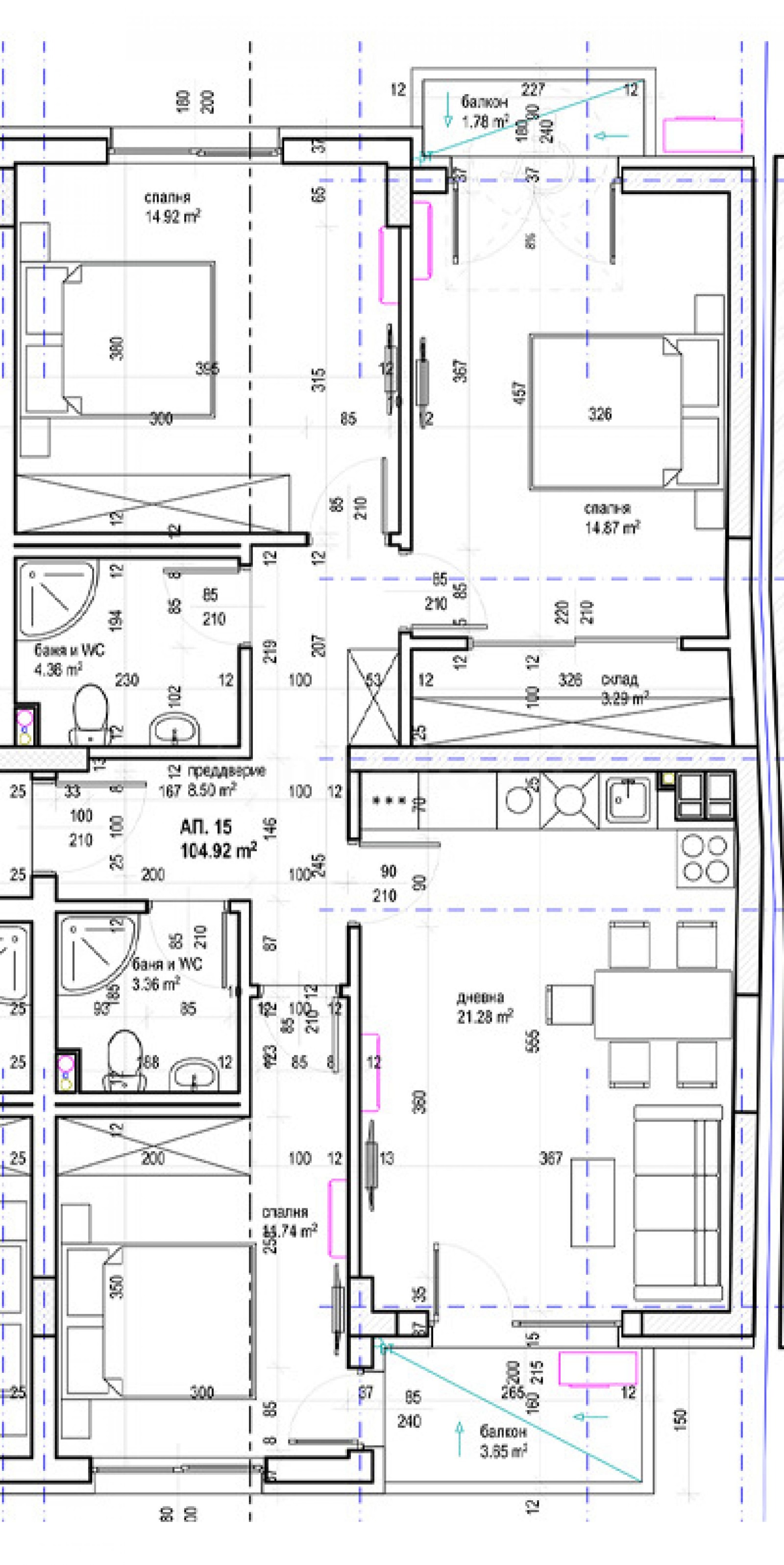 Имотът се намира на 4-ти етаж и има обща площ 125.62 кв.м, чиста площ - 104.92 кв.м.
