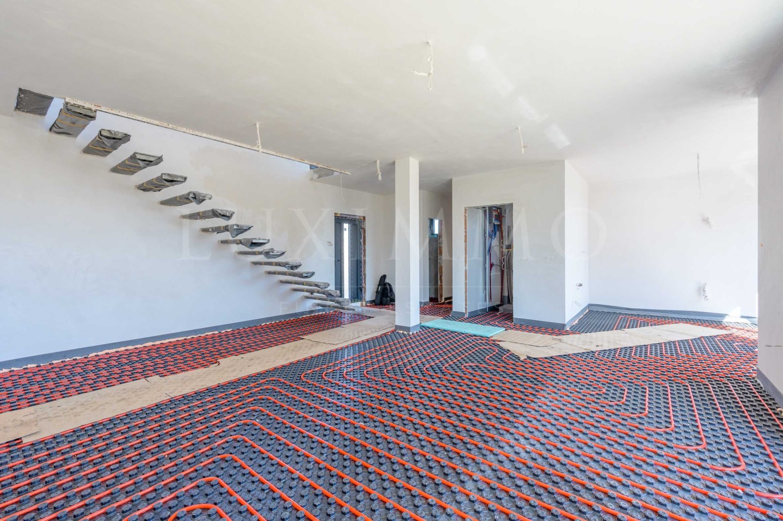 - Вторият етаж предлага три големи спални, две бани с тоалетни, гардеробна и просторна тераса с изцяло южно изложение, която осигурява естествена светлина през целия ден. Етажът предоставя уединение и функционалност, съобразени с нуждите на съвременно семейство.