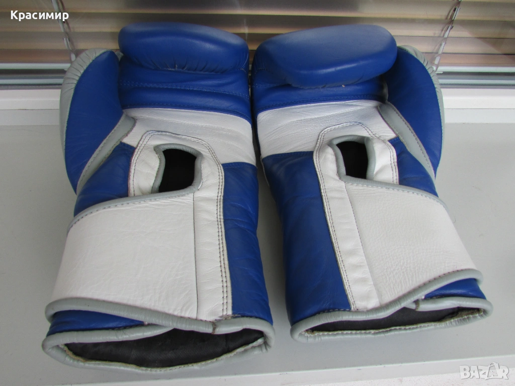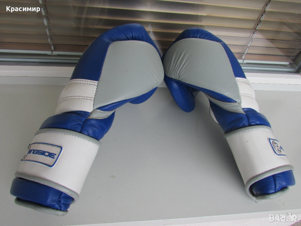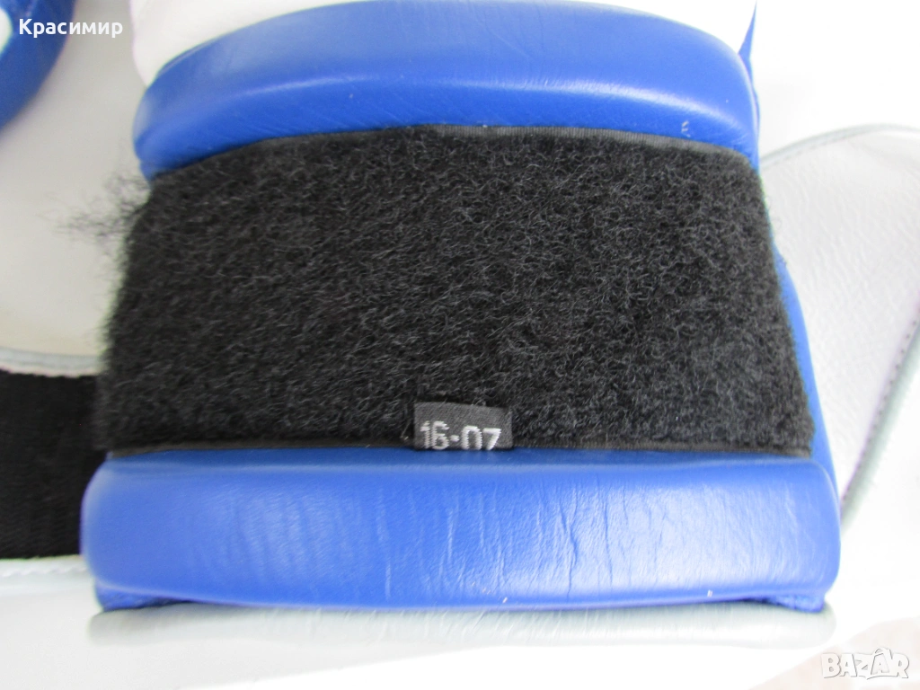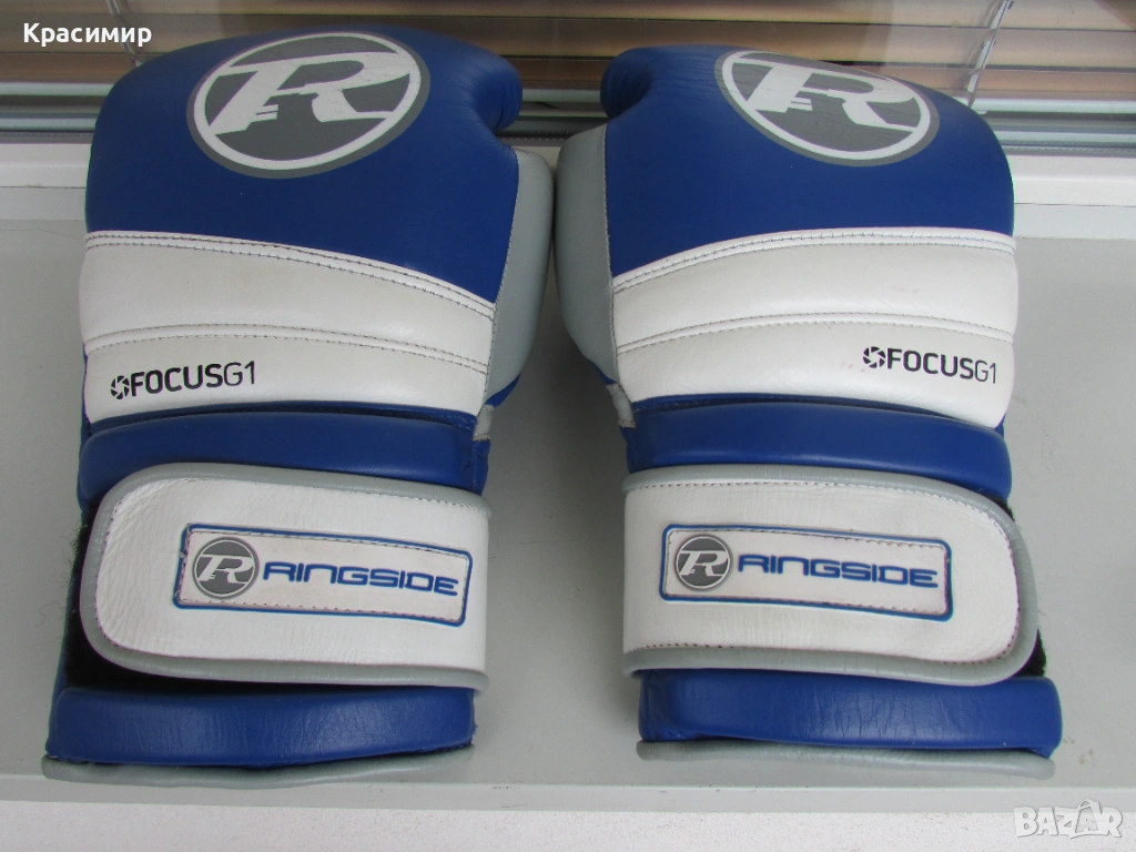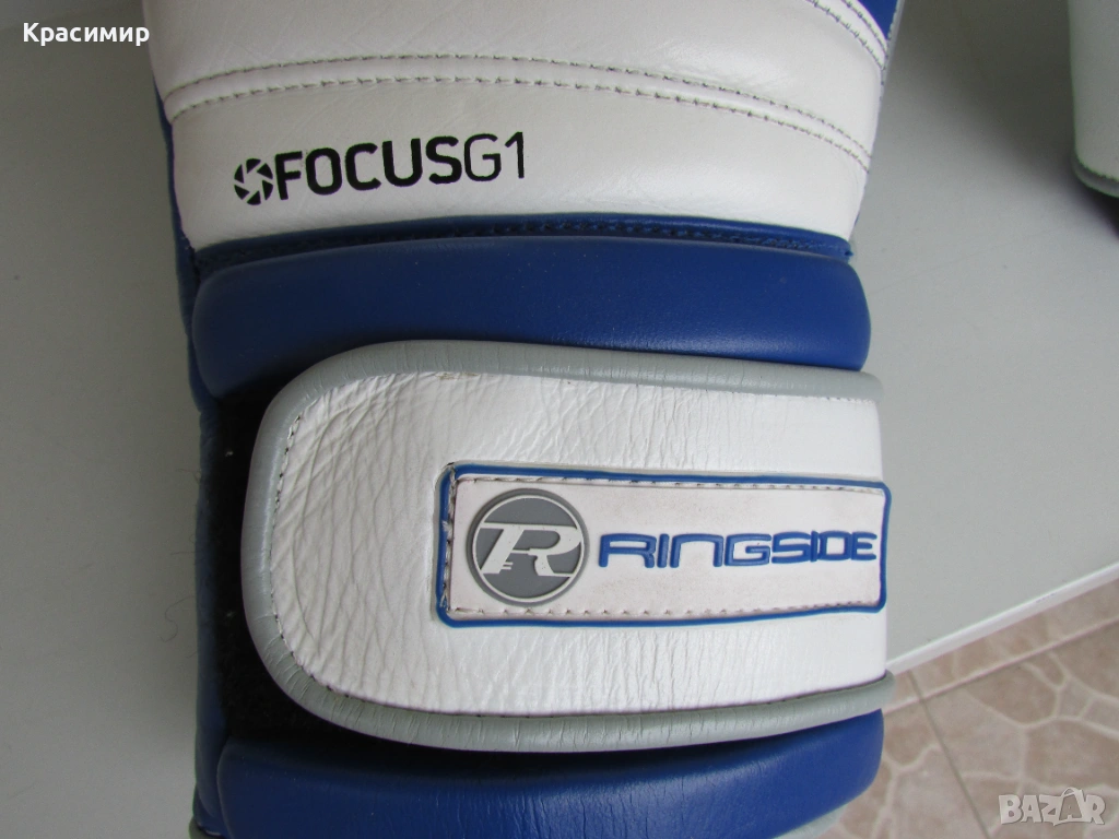 Професионални боксови ръкавици Ringside Pro Training G1, изработени от първокласна естествена кожа(premium hide leather), в синьо - бяло - сиво. Имат 3 - слойна подплата от пяна, която абсорбира удара и намалява риска от нараняване, допълнителна защита на китката и дланта, с широка велкро лента, осигуряваща стабилно прилягане. Подходящи са за интензивни тренировки и спаринги. Размер 16 OZ. Ръкавиците са в много - добро състояние, като единствената забележка е малка дупчица на подплатата на дясната ръкавица, видимо на последната снимка.