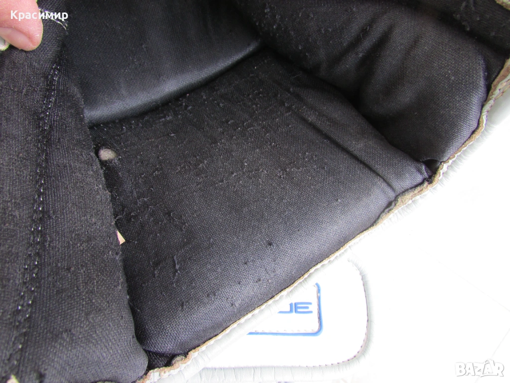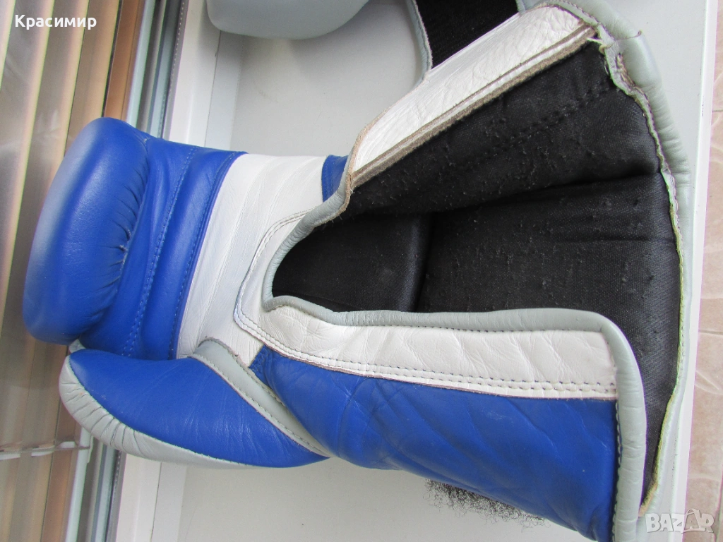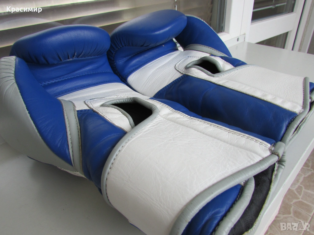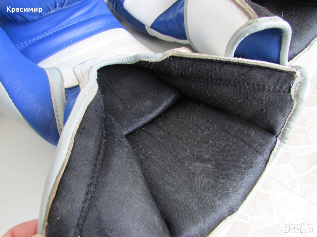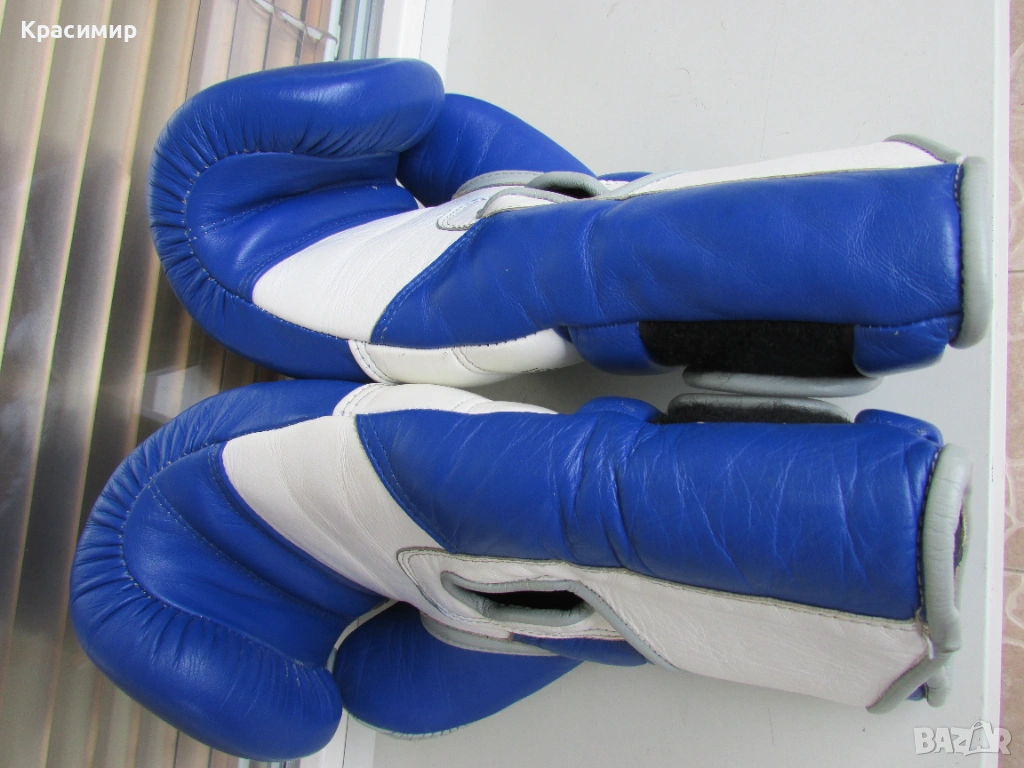 Професионални боксови ръкавици Ringside Pro Training G1, изработени от първокласна естествена кожа(premium hide leather), в синьо - бяло - сиво. Имат 3 - слойна подплата от пяна, която абсорбира удара и намалява риска от нараняване, допълнителна защита на китката и дланта, с широка велкро лента, осигуряваща стабилно прилягане. Подходящи са за интензивни тренировки и спаринги. Размер 16 OZ. Ръкавиците са в много - добро състояние, като единствената забележка е малка дупчица на подплатата на дясната ръкавица, видимо на последната снимка.