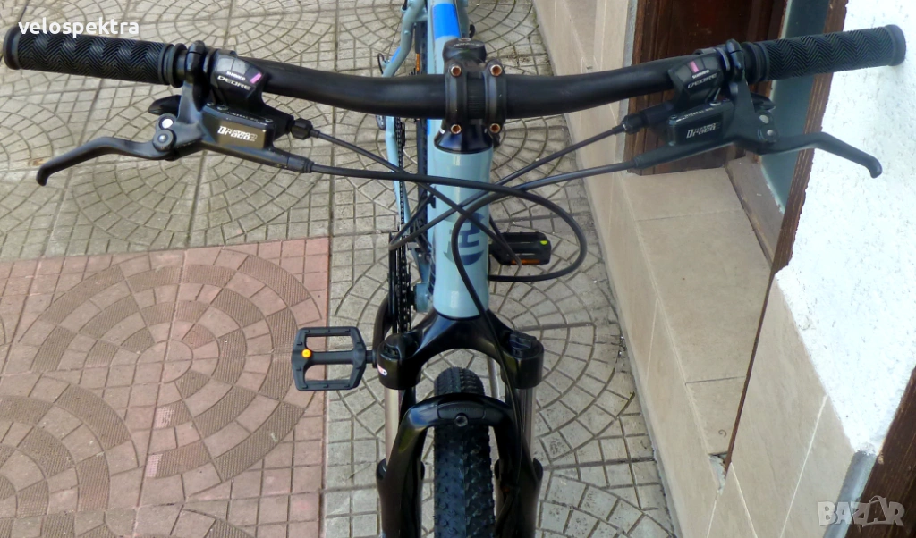 27 скорости Шимано Деоре СЛХ , палцови команди 3х9 Шимано Деоре с дисплей. Две дискови хидравлични спирачки Тектро диск 180/160 .