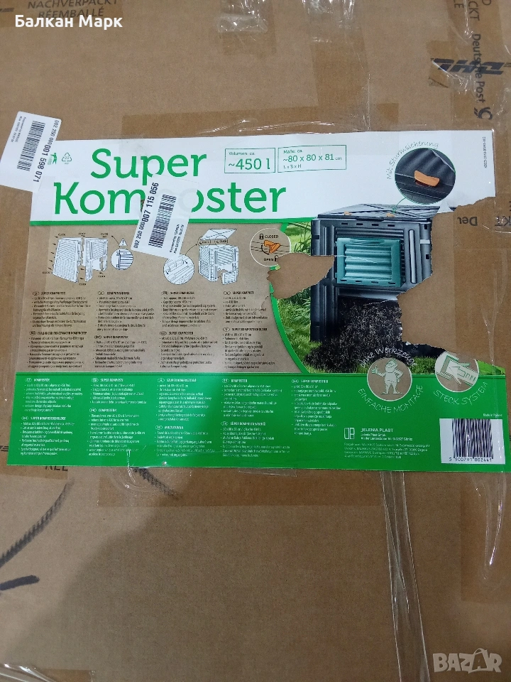Продавам практичен градински компостер, част от разнообразна палетирана стока от Германия. Моделът е проектиран за лесна употреба и ефективно превръщане на битови и градински отпадъци в естествен тор.