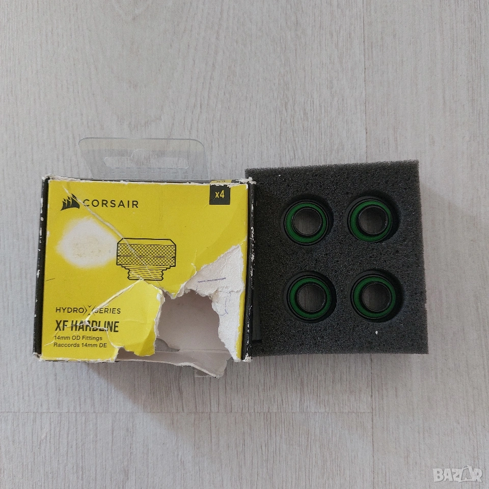 Продавам висок клас компресионни фитинги за водно охлаждане Corsair Hydro X Series XF Hardline. Комплектът съдържа 4 броя фитинги в оригиналната си опаковка с предпазна вложка. Продуктът е чисто нов и никога не е монтиран в система.