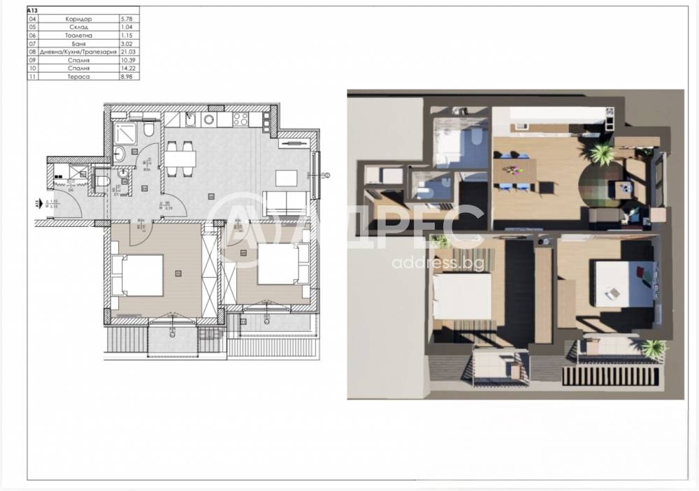 Апартаментът се състои от светла дневна с кухненски бокс, две самостоятелни спални, баня с тоалетна, втора тоалетна, тераса и складово помещение.
