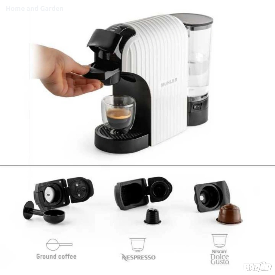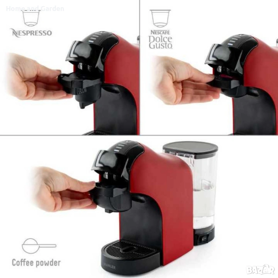 Система за работа с 3 различни адаптери: Подходяща за капсули Nespresso, Dolce Gusto и мляно кафе;