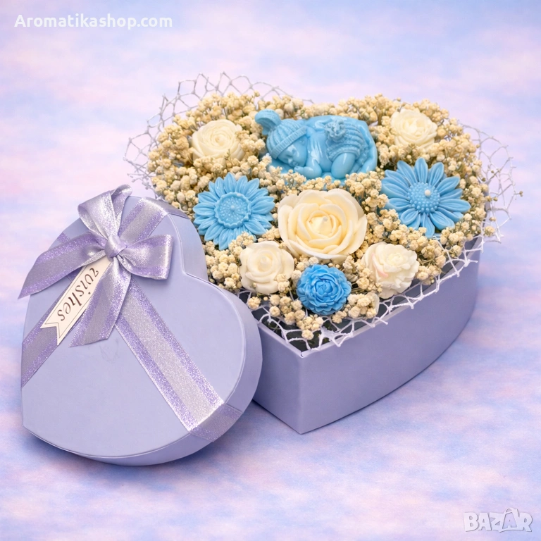 Композицията включва внимателно оформени соеви рози в синьо и кремаво, детайлни цветчета, бебешки фигурки и фина гипсофила, които придават обем, текстура и нежна въздушност. Всичко е подредено в светлолилава сърцевидна кутия с панделка – изискан завършек, който подчертава чистата и ангелска визия на букета.
