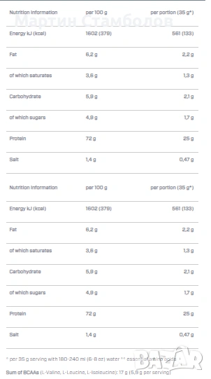 Всяка доза съдържа 5,9–6,1 г BCAA, включително 2,6–2,7 г от ключовата аминокиселина L-левцин, в зависимост от вкуса