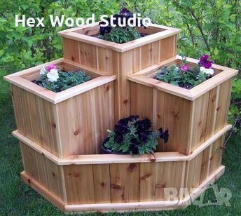 Различните нива добавят дълбочина и динамика, превръщайки обикновената кашпа в истински дизайнерски елемент. Топлият цвят на дървото подчертава естествената красота на растенията и създава хармония между форма и природа.
