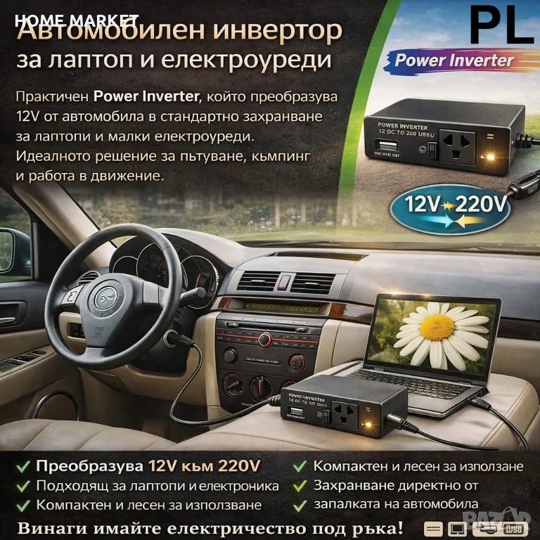 Практичен универсален адаптер за лаптоп, който може да се използва както в автомобила, така и в домашни условия. Устройството е подходящо за захранване и зареждане на различни модели лаптопи чрез включване към запалката на автомобила (12V) или към електрическата мрежа (220V).