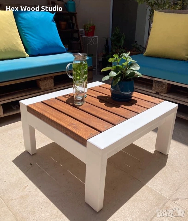 Контрастът между светлата рамка и топлия дървен плот създава усещане за чистота и уют едновременно. Масата е достатъчно малка, за да бъде удобна, но и достатъчно функционална – идеална за напитки, декорация или следобедно кафе на открито.