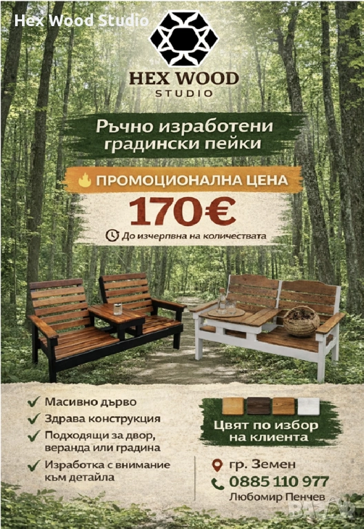 Топлината на естественото дърво контрастира елегантно с конструкцията, създавайки баланс между устойчивост и стил. Подходяща както за двор и градина, така и за веранда или тераса, тази пейка не е просто мебел – тя е покана за почивка.