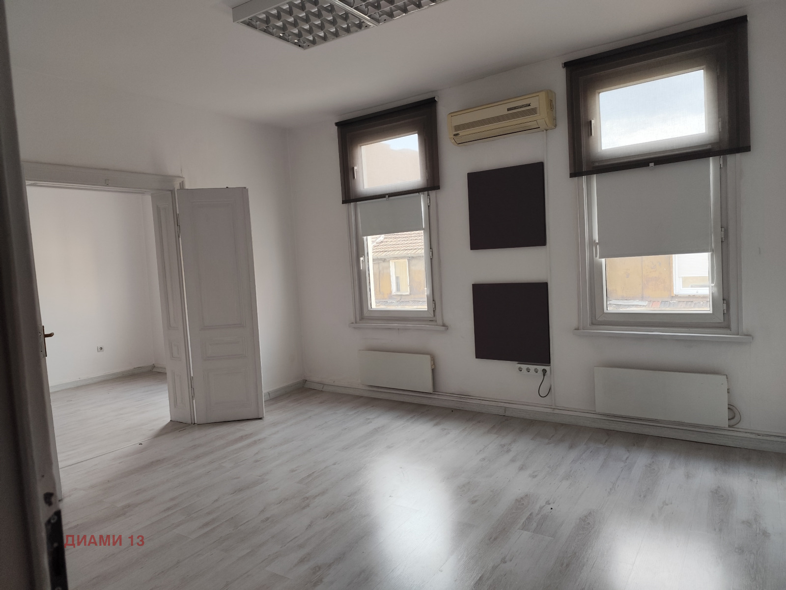Разпределението включва: Вестибюл/приемна/ с 5 работни голями и светли помещения.Склад и кухненски бокс с излаз на тераса ,към вътрешен двор.Два санитарни възела.Отопление на ток.Климатици и конвекторни радиатора.Подовите настилки са на ламинат.Стени-латекс.Сградата е без асансьор.Имота разполага. със СОТ.