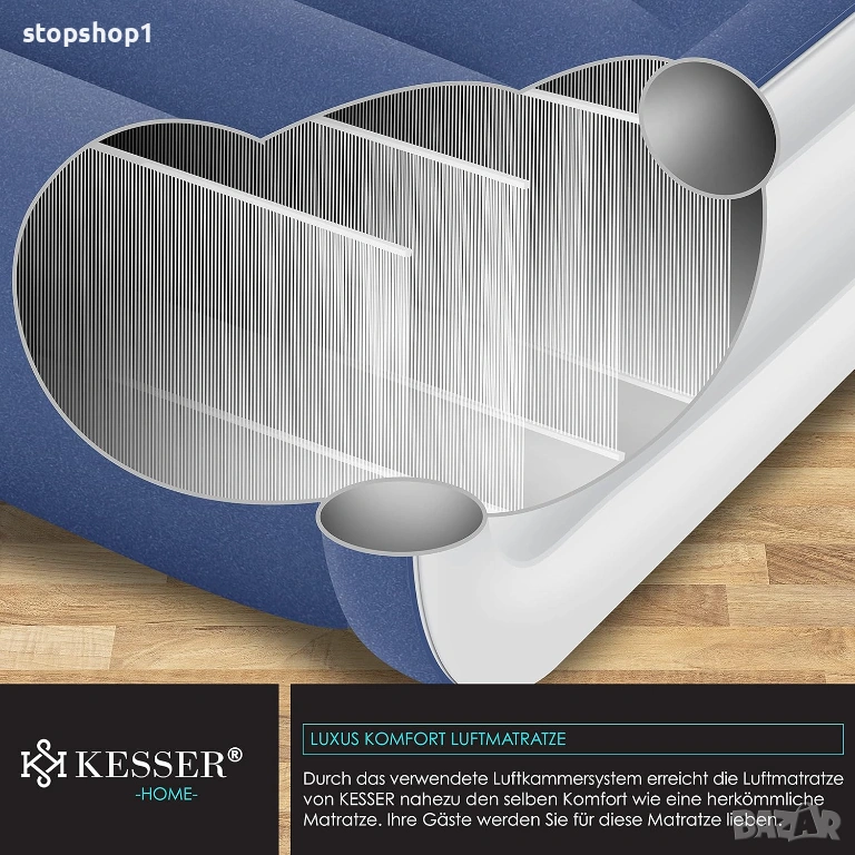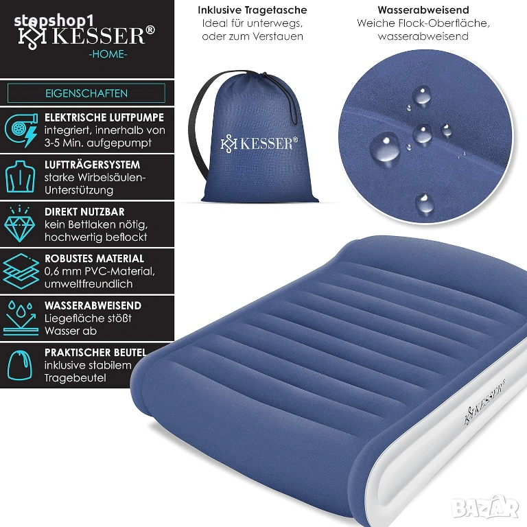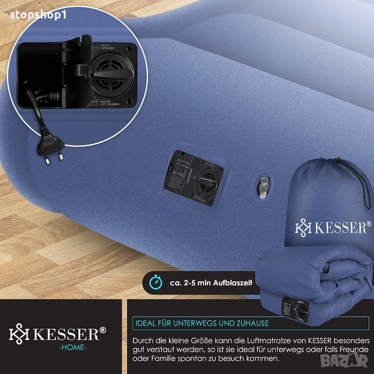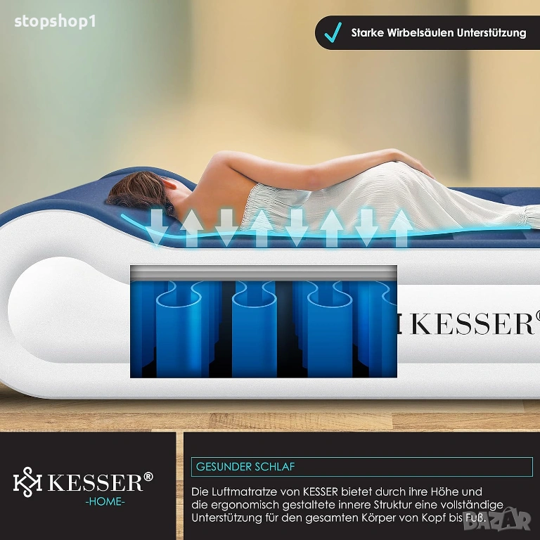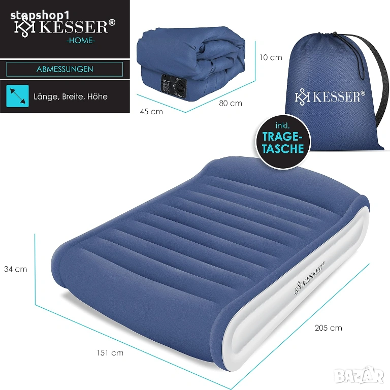 - Ергономичен и удобен: Структурата и височината поддържат тялото в легнало положение. Дори взискателни хора ще лежат удобно и гръбнакът ви ще бъде поддържан. Водоотблъскващата повърхност за лягане осигурява сухо място за сън. Благодарение на използваната система с въздушни камери, надуваемият матрак Kesser постига същия комфорт като конвенционалния матрак. Интегрираната възглавница осигурява допълнително облекчение за врата.