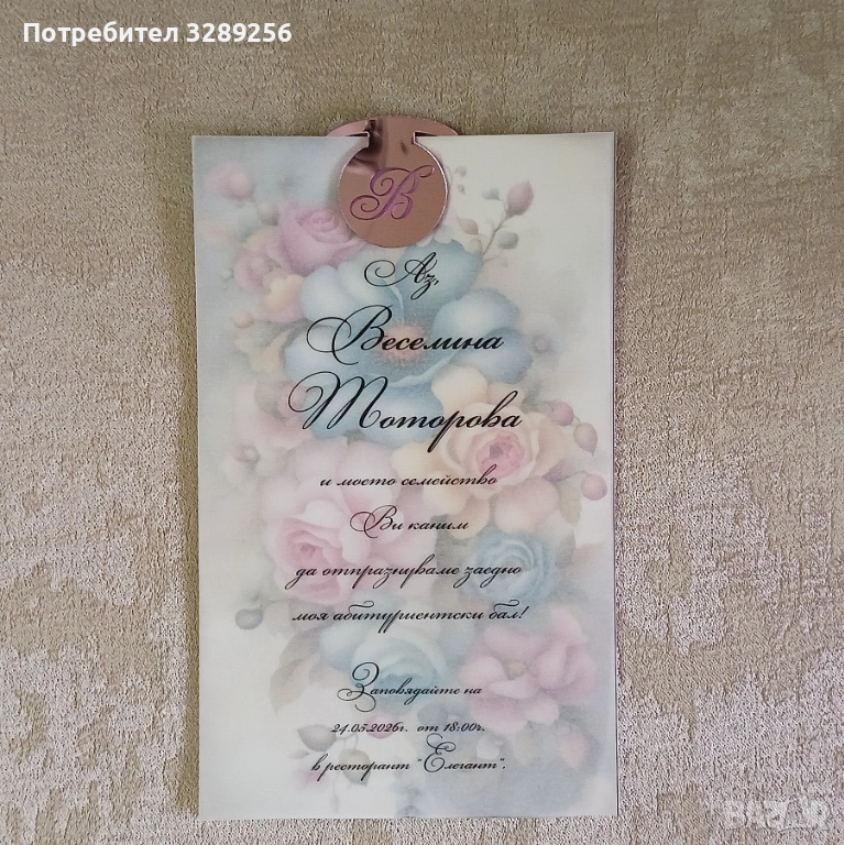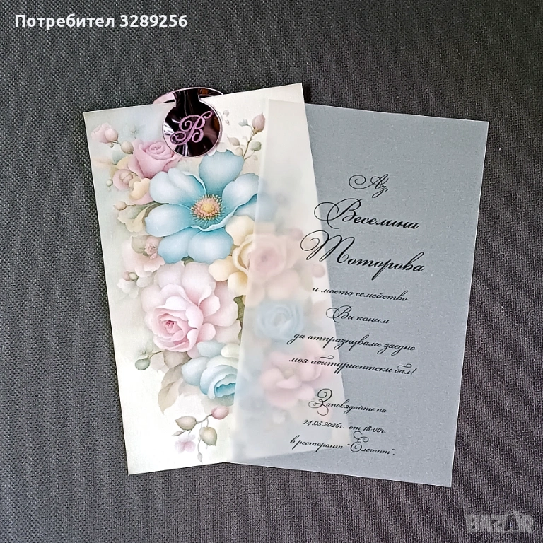 Отпечатана на перлен картон. Паус с текста на поканата. Тагче от златно, сребърно или розово огледало с инициалите на абитуриента.