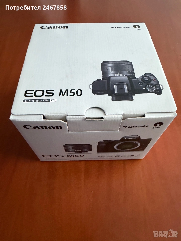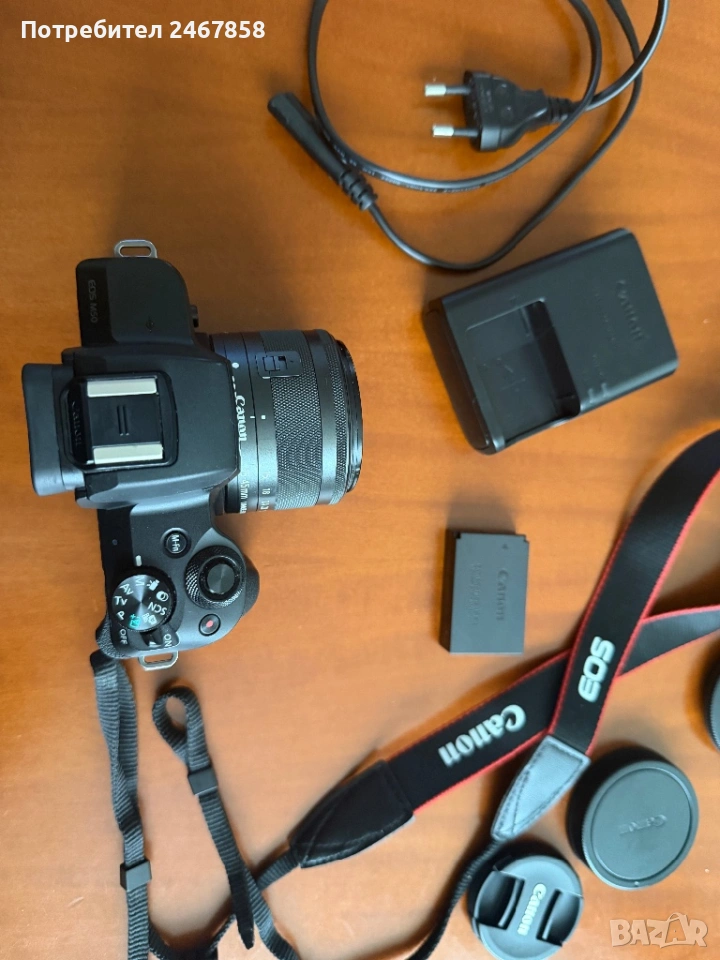 Комплектът включва: тяло Canon M50, Обектив EF-M 15-45mm, Батерия, Оригинално зарядно, Ремък за носене през врата и оригиналните капачки за обектива и тялото.