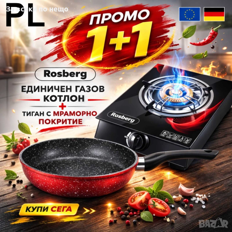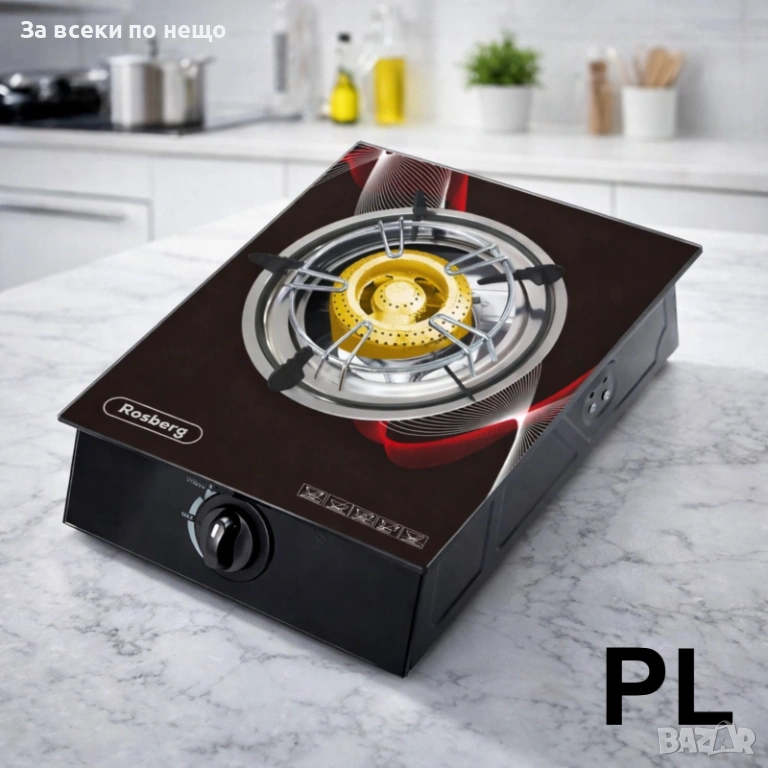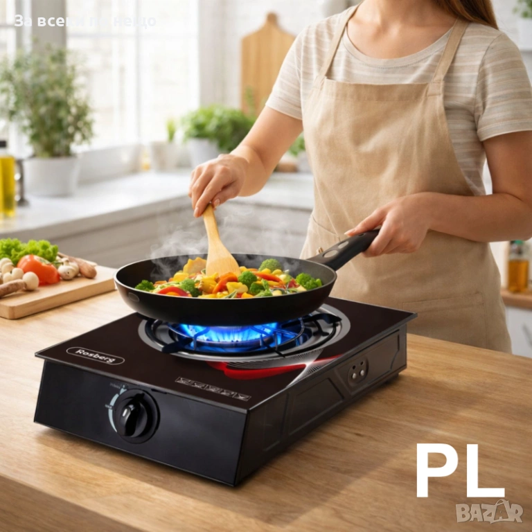 Практично и функционално решение за готвене у дома или на открито – промо пакетът включва единичен газов котлон Rosberg RP51454GA (30 mbar) и дълбок тиган Rosberg 26 см с мраморно незалепващо покритие в елегантен бордо меланж.