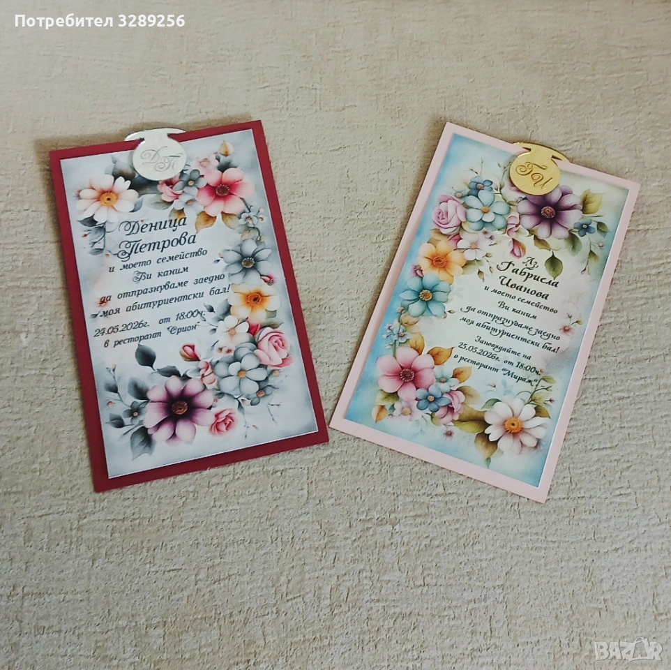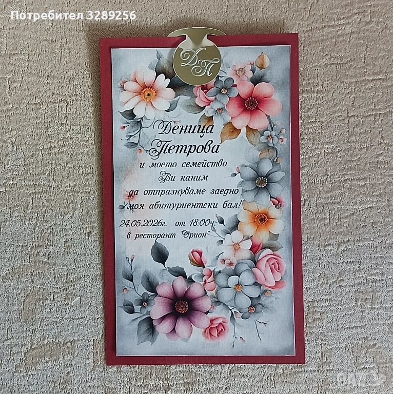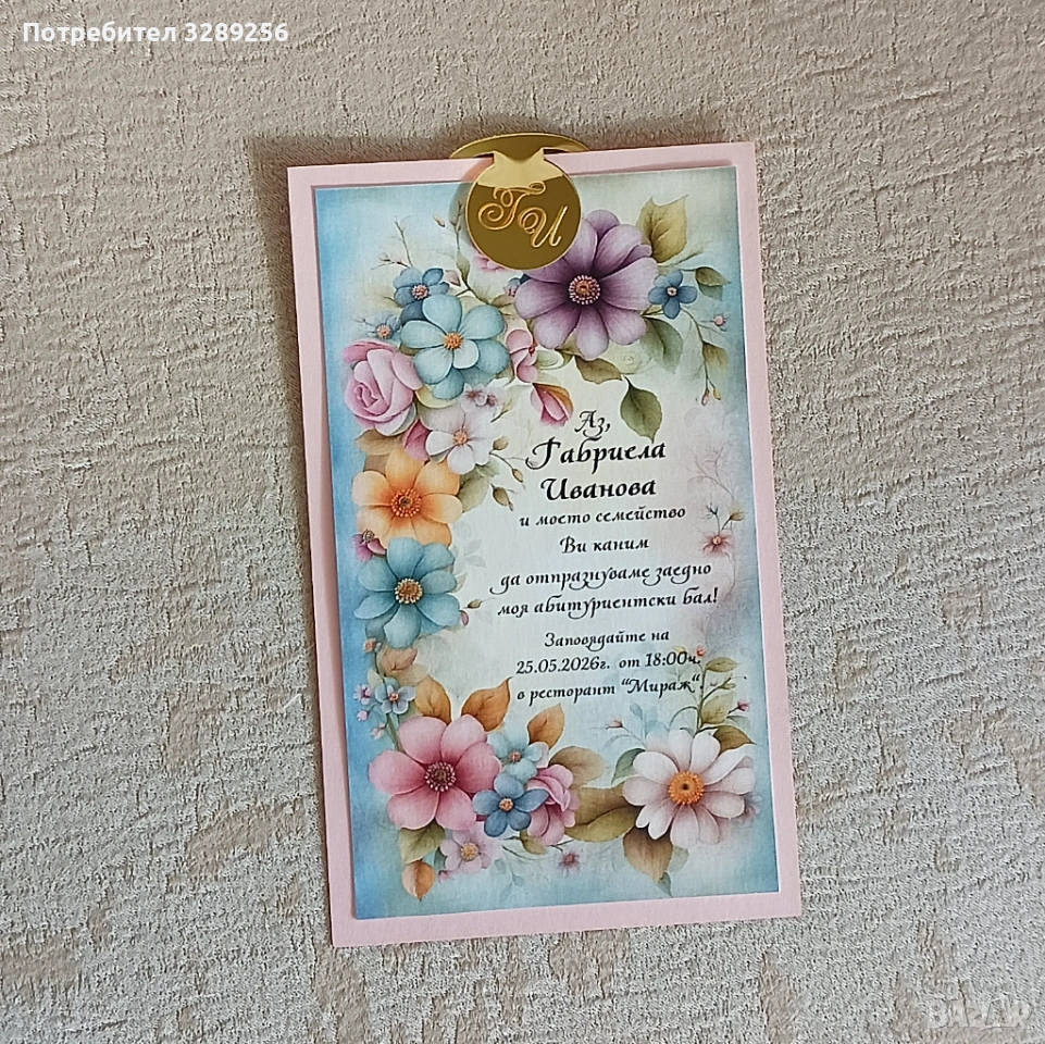 Отпечатана на перлен картон. Подложка от перлен картон в цвят по избор. Тагче от златно, сребърно или розово огледало с инициалите на абитуриента.