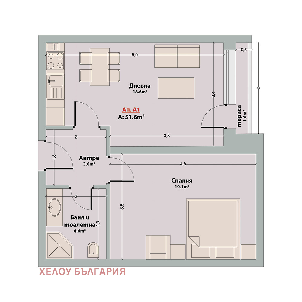 Агенция за недвижими имоти Hello Bulgaria представя светъл и добре проектиран двустаен апартамент с удобно разпределение и тераса.