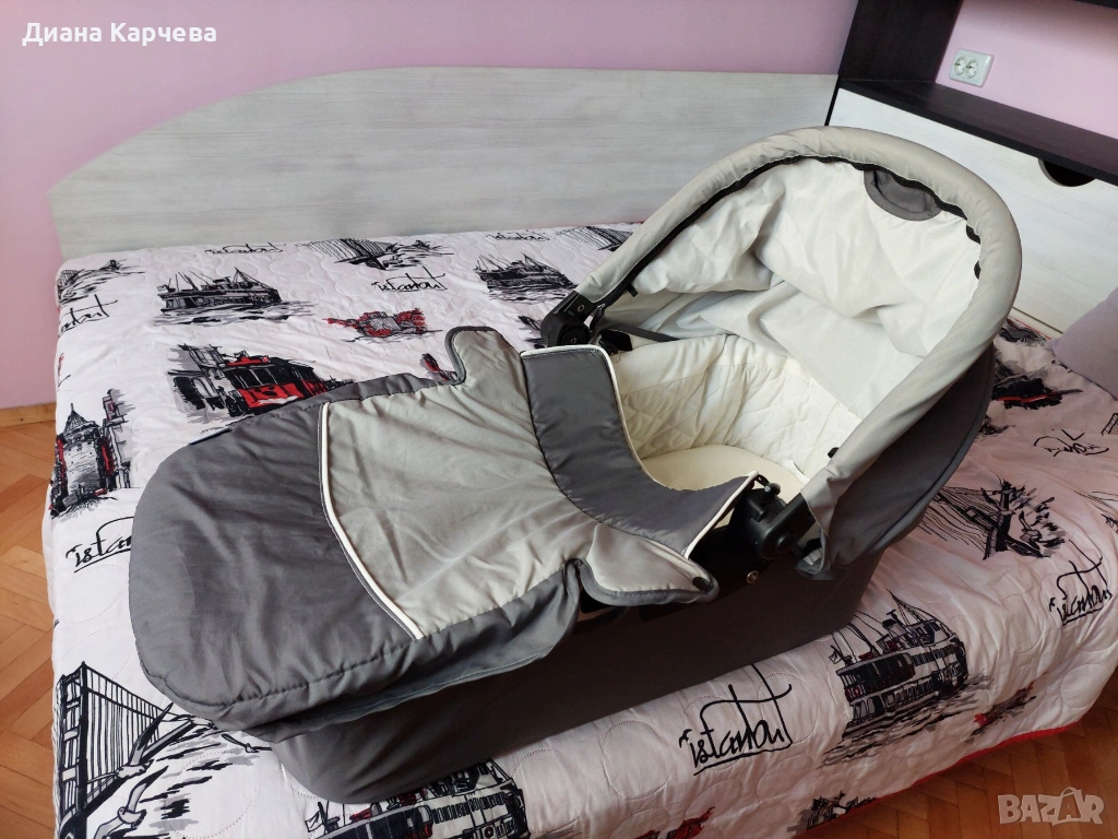 Състои се от 3 части - кош за новородено, седалка и столче за кола. Сгъваема е и има багажник.
