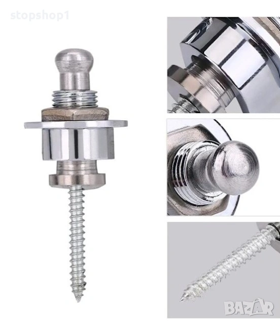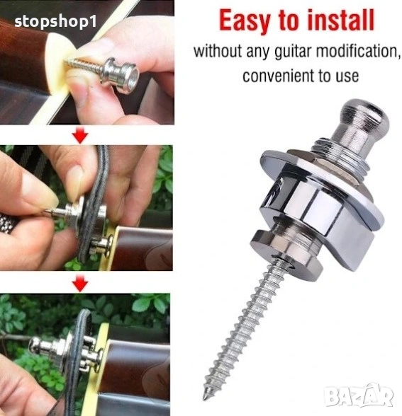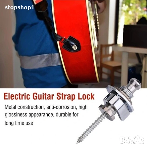 Заключването на китарната каишка е изработено от метален материал, който е издръжлив и здрав, не се чупи лесно.\nФункция: неплъзгащи се опори, могат да се завинтят здраво в заключено положение.\nПодходящо за: подходящо за всички видове електрически китари. Бърз и лесен монтаж.\nМонтаж: разхлабете фиксиращата гайка от заключващия механизъм на каишката, завийте щифта на китарата; заключете каишката с бутона за заключване на каишката; Поставете задържащата гайка в ключалката на каишката.