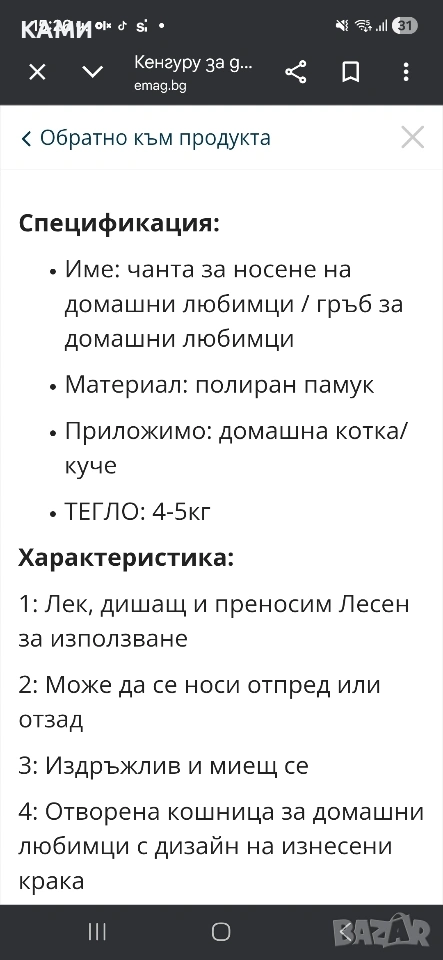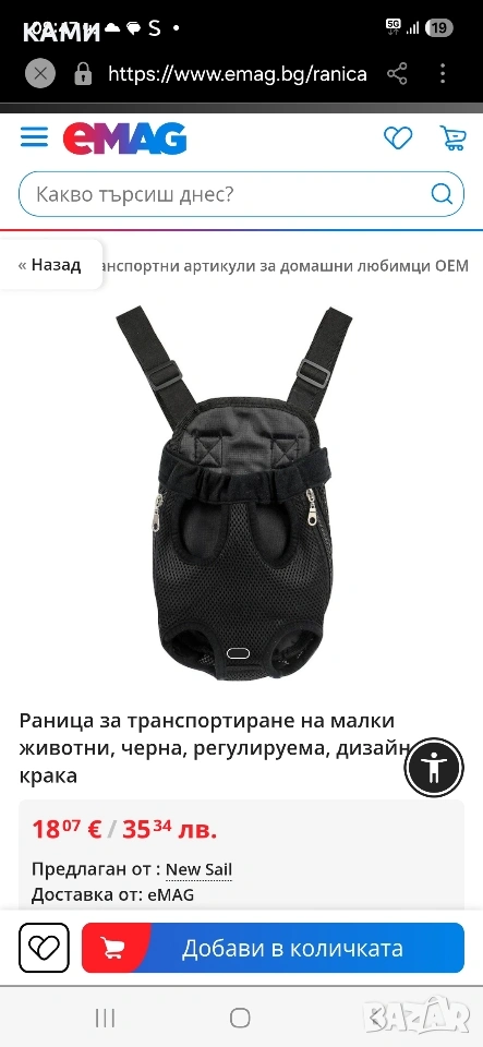 Чанта/ кенгуро за малко куче/котка → Обява 53998728