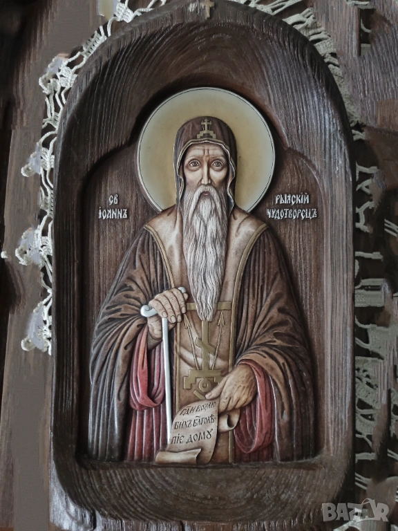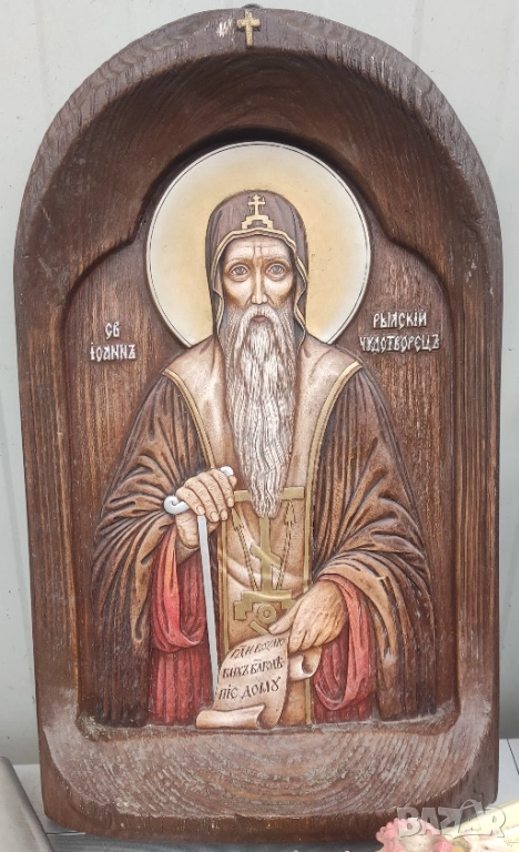 1. Дърворезбована голяма икона на Свети Иван Рилски Чудотворец. Ръчно изработена и рисувана. Със сертификат за автентичност. Използвани са екологично чисти материали, дърво, грунтове, темперни бои, златно и сребърно покритие (варак), естествени лакове и патина. Размер: 37/23/6. Отлично състояние.