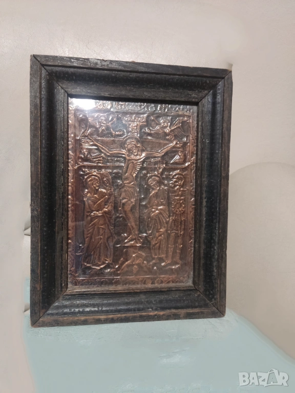 2. Стара медна икона, ръчна изработка, представляваща сцената „Разпятие Христово“ в масивна дървена рамка. Религиозна икона, изработена чрез релефно гравиране върху медна повърхност.