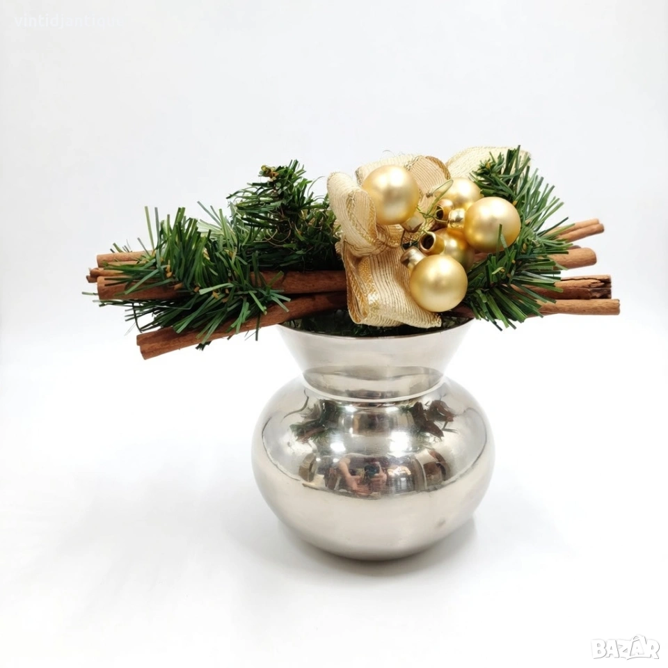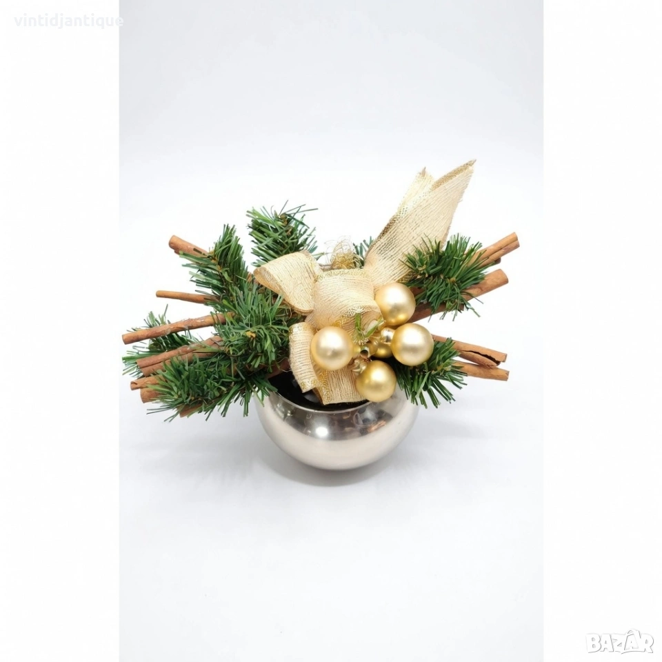Декорация, включваща елхови клонки, канелени пръчки и златни топки във ваза → Обява 53998885