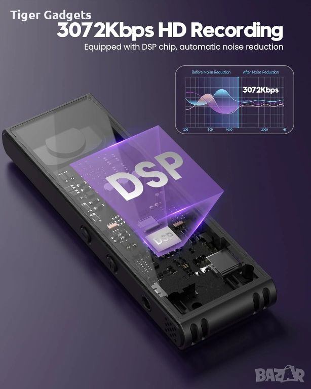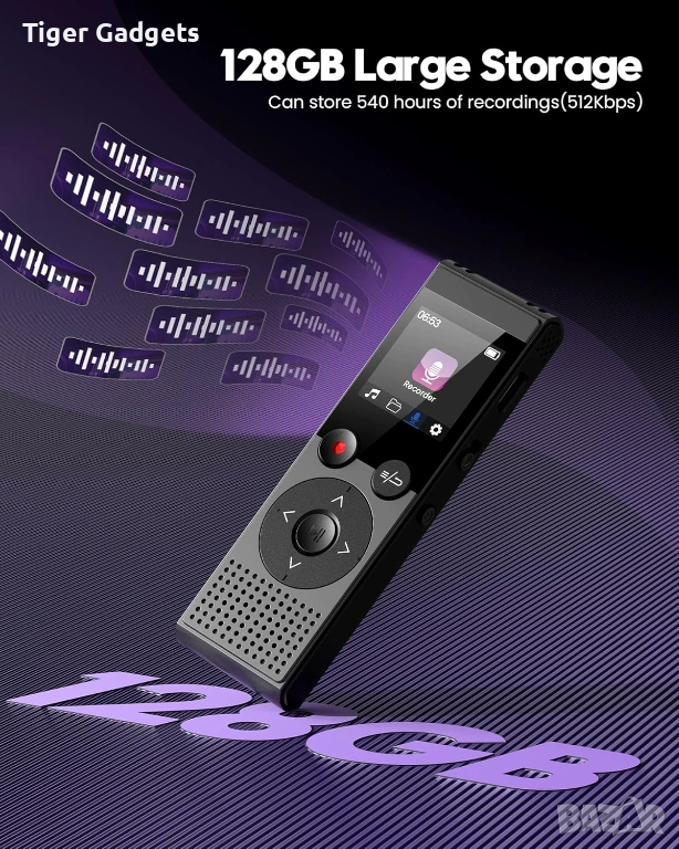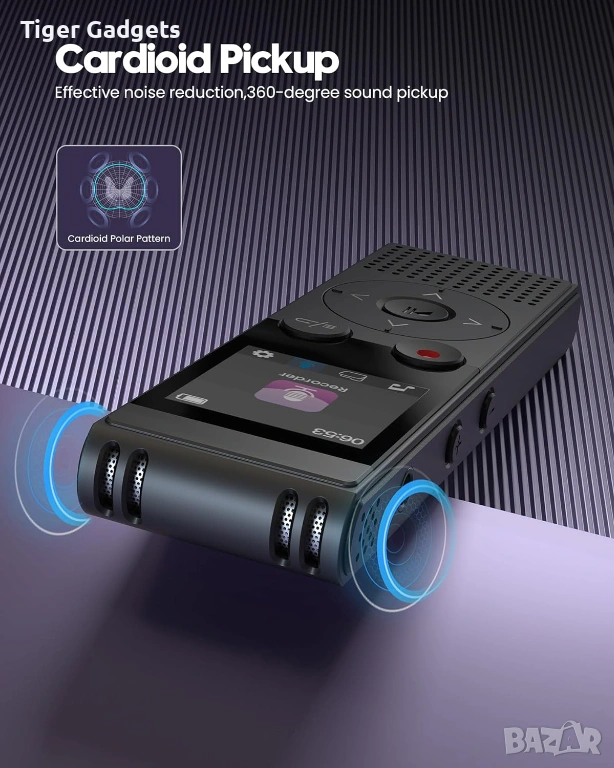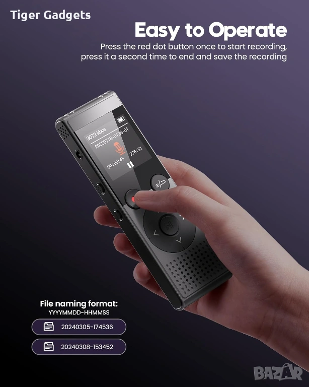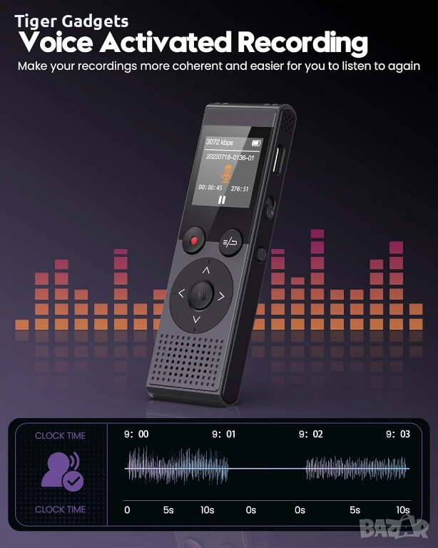 Устройството разполага с гласово активирано записване, което автоматично стартира при звук и спира при тишина. Благодарение на HD аудио запис и noise cancelling, записите са ясни и чисти.