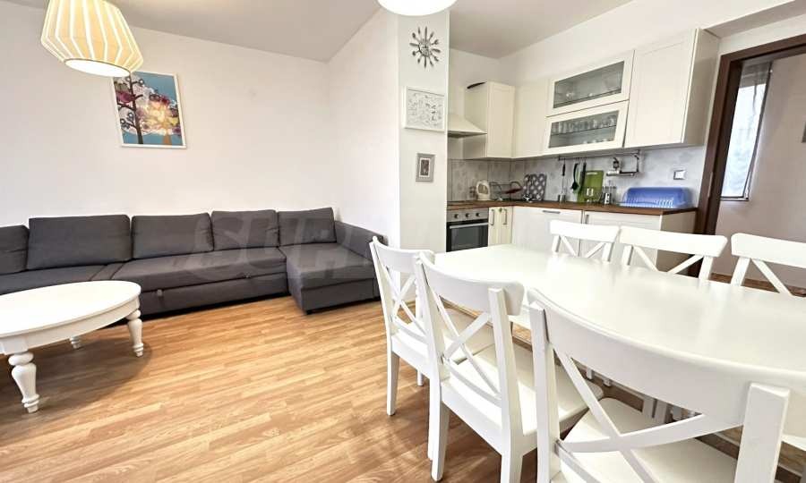 Просторен хол с обособен кухненски бокс светло и широко помещение, обзаведено изцяло в бяло и включва: кухненска част, маса за хранене, ъглов диван, холна маса, гардероб, телевизор;