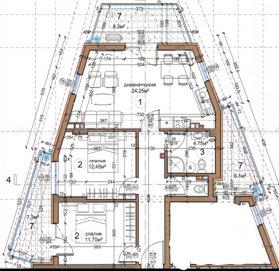 🔷 Разпределение: входно антре, всекидневна с кухненски бокс с излаз на балкон, тоалетна, баня с тоалетна, две спални с излаз на балкон, подземно складово помещение 3.45 кв.м.