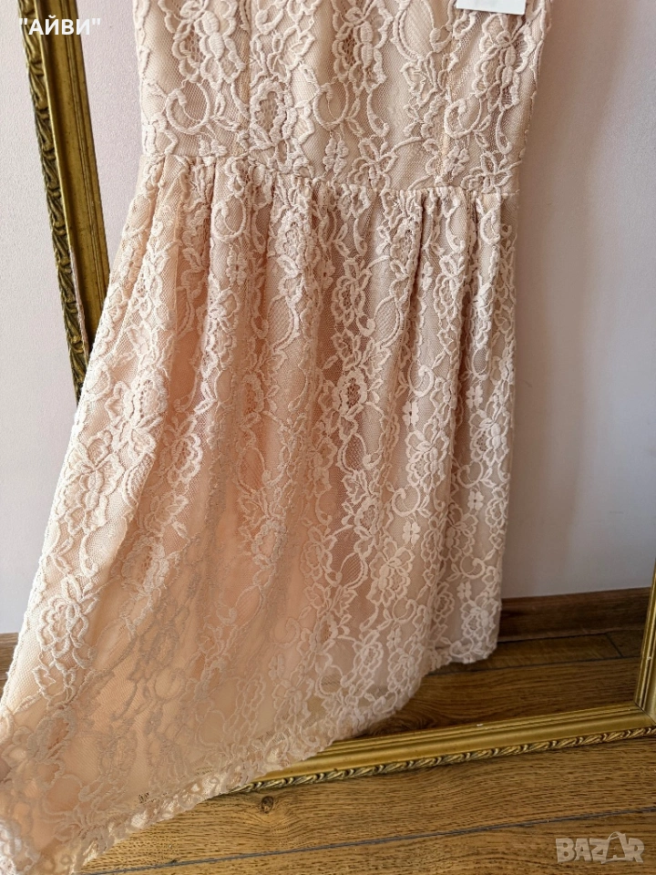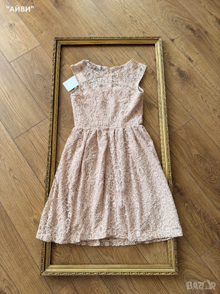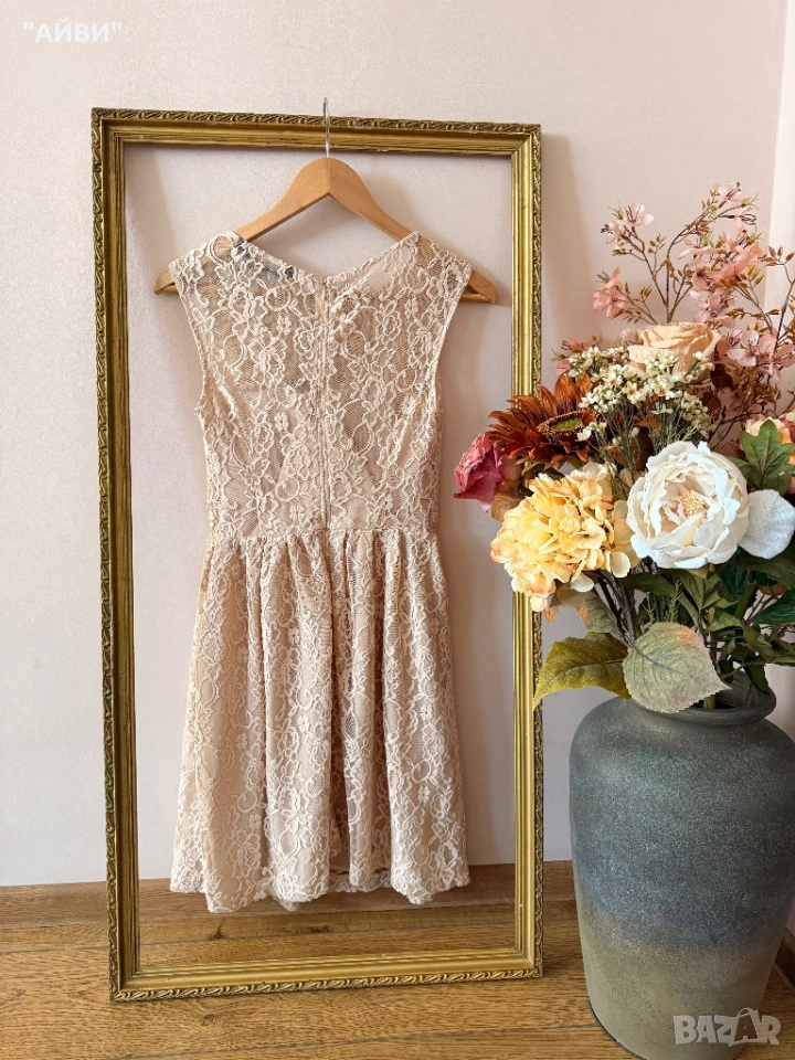 Тази рокля е от линията ZARA Woman и се характеризира с елегантен дизайн от рязана дантела на цветя в цвят пудра или „nude“.