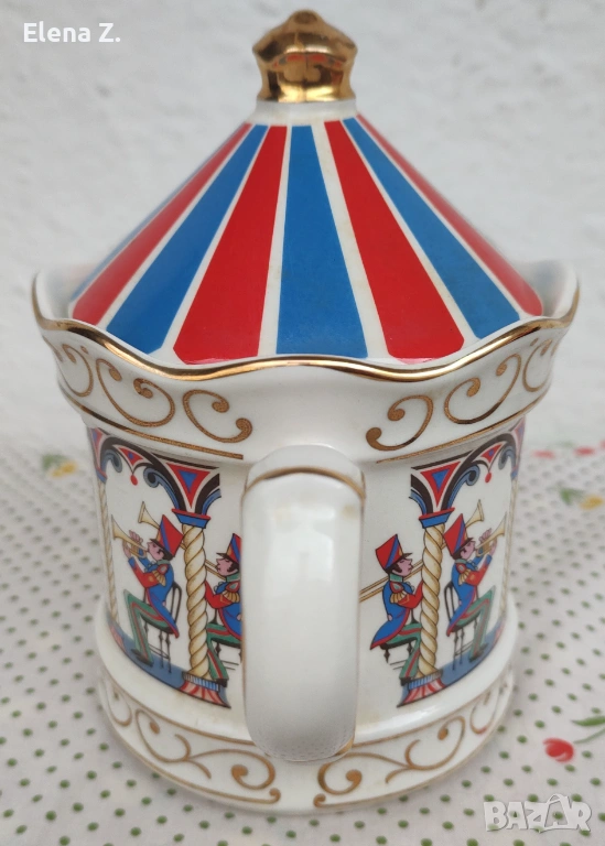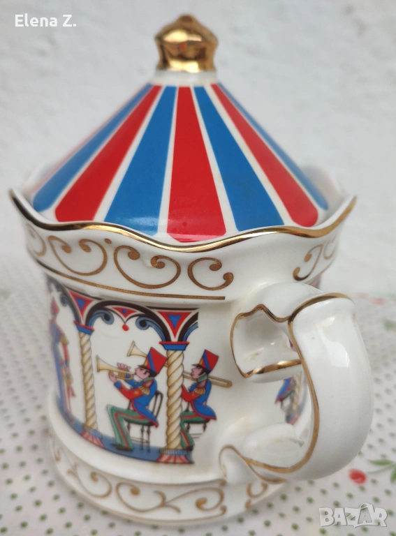 С чудесна форма, всестранно декориран с цветни илюстрации, и с весел капак, наподобяващи циркои купол със златна дръжчица и чудесни златни кантове и орнаменти.