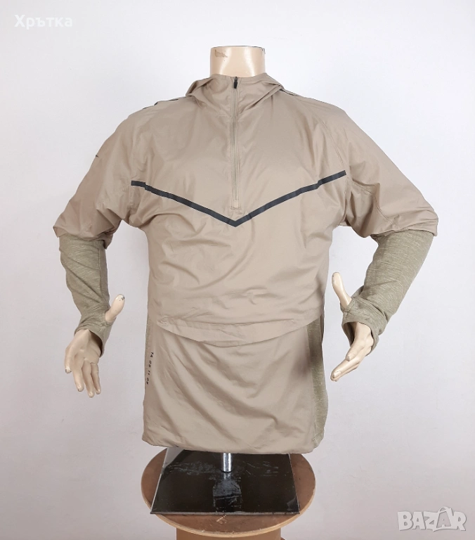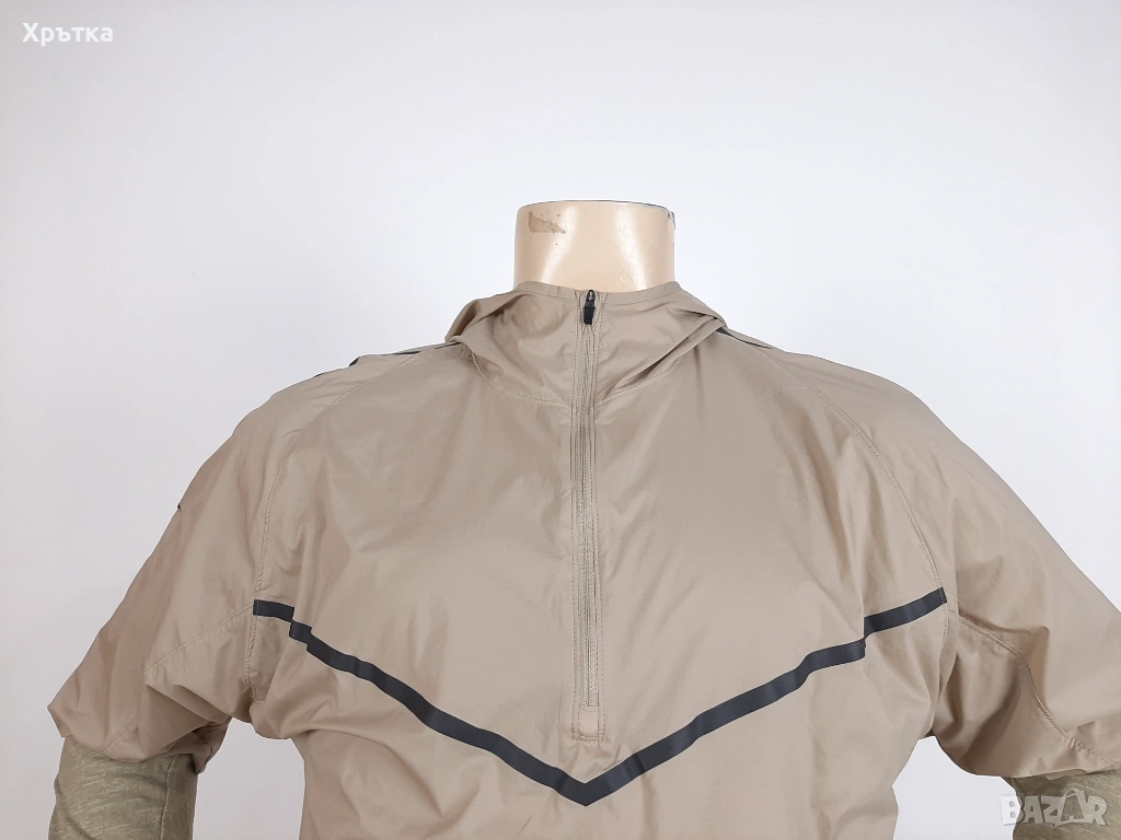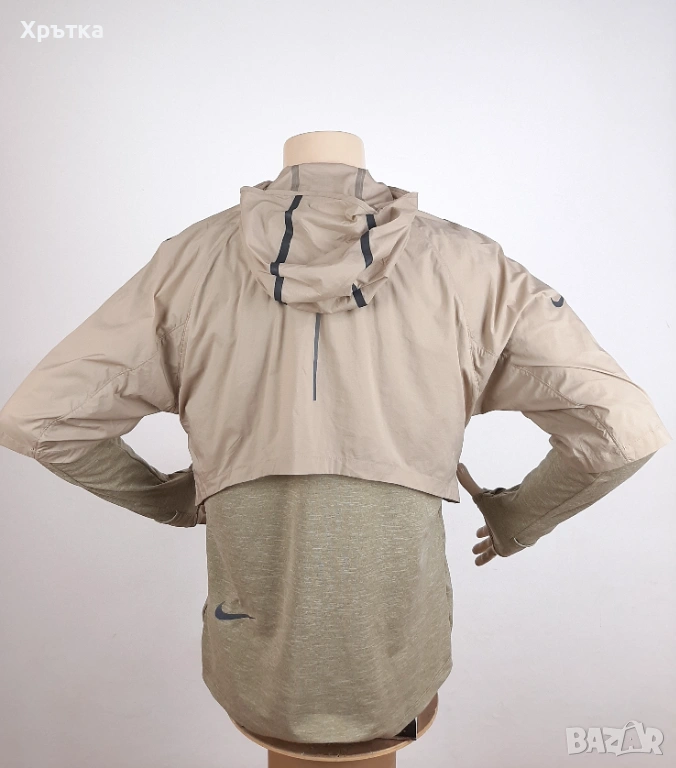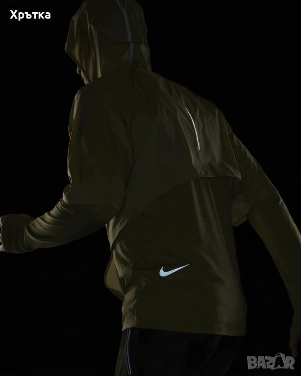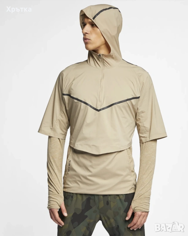 Уникален "трансформиращ" дизайн – състои се от вътрешна блуза с Nike Sphere материя за лека топлина и ултралеко външно яке (shell), което лесно се прибира в предния джоб, докато се движите.