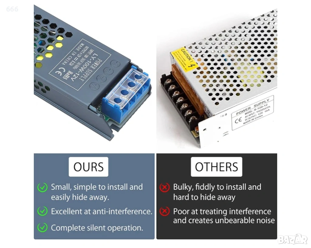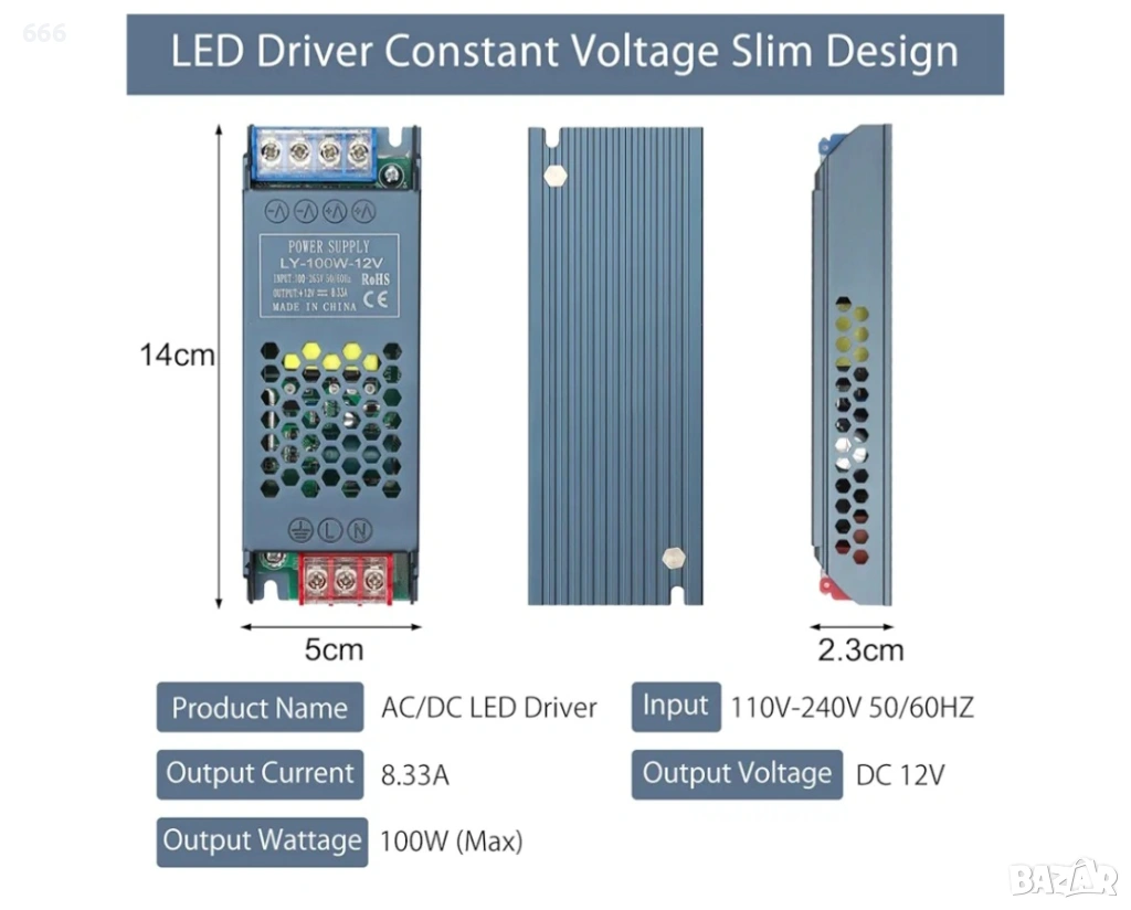Забележка: Не е димируем. LED трансформатор 12 V 100 W AC вход 190-240 V, 50 Hz, постоянно напрежение DC изход: 12 V, изходен ток: 8,3 A. Максимално натоварване: 100 вата. Размери: 5,2 x 2,4 x 13,8 см.