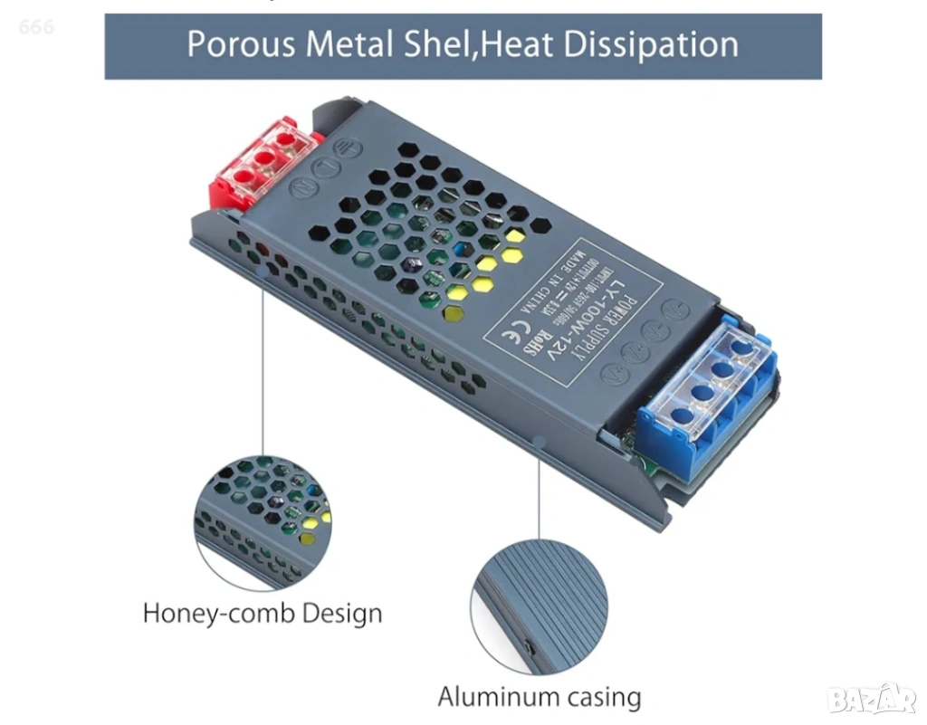 Добро разсейване на топлината: ултратънкият алуминиев корпус на трансформатор 12 V 100 W с отвори за радиатор тип „пчелна пита“ улеснява разсейването на топлината и може да удължи живота на захранването. Тънък по размер, голяма производителност. С дебелина само 23 мм, изисква минимално място за монтаж и лесно се скрива.