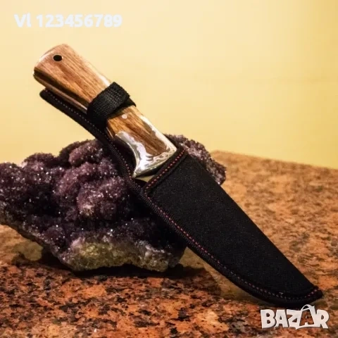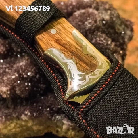 Нож с фиксирано острие и много красив дизайн. Дръжката е изработена с много удобна, пасваща на дланта форма и е стабилно занитена. В края на дръжката е занитена бронзова тръбичка, осигуряваща възможност за поставяне на ремък или паракорд. Гардът е метален, с красиви инкрустации от двете страни, които се вписват отлично в елегантната визия на този модел. В предната част на дръжката има метален гард Острието на ножа е широко около 3.5 см, двустранно скосено и много добре заточено. Окомплектован с кания от здрав плат за удобно и безопасно носене на колан.