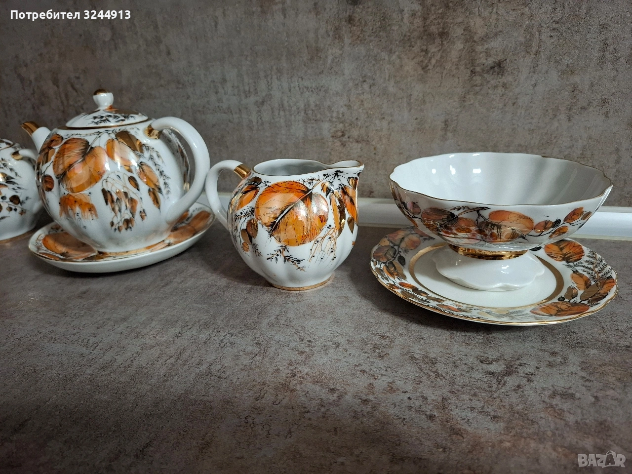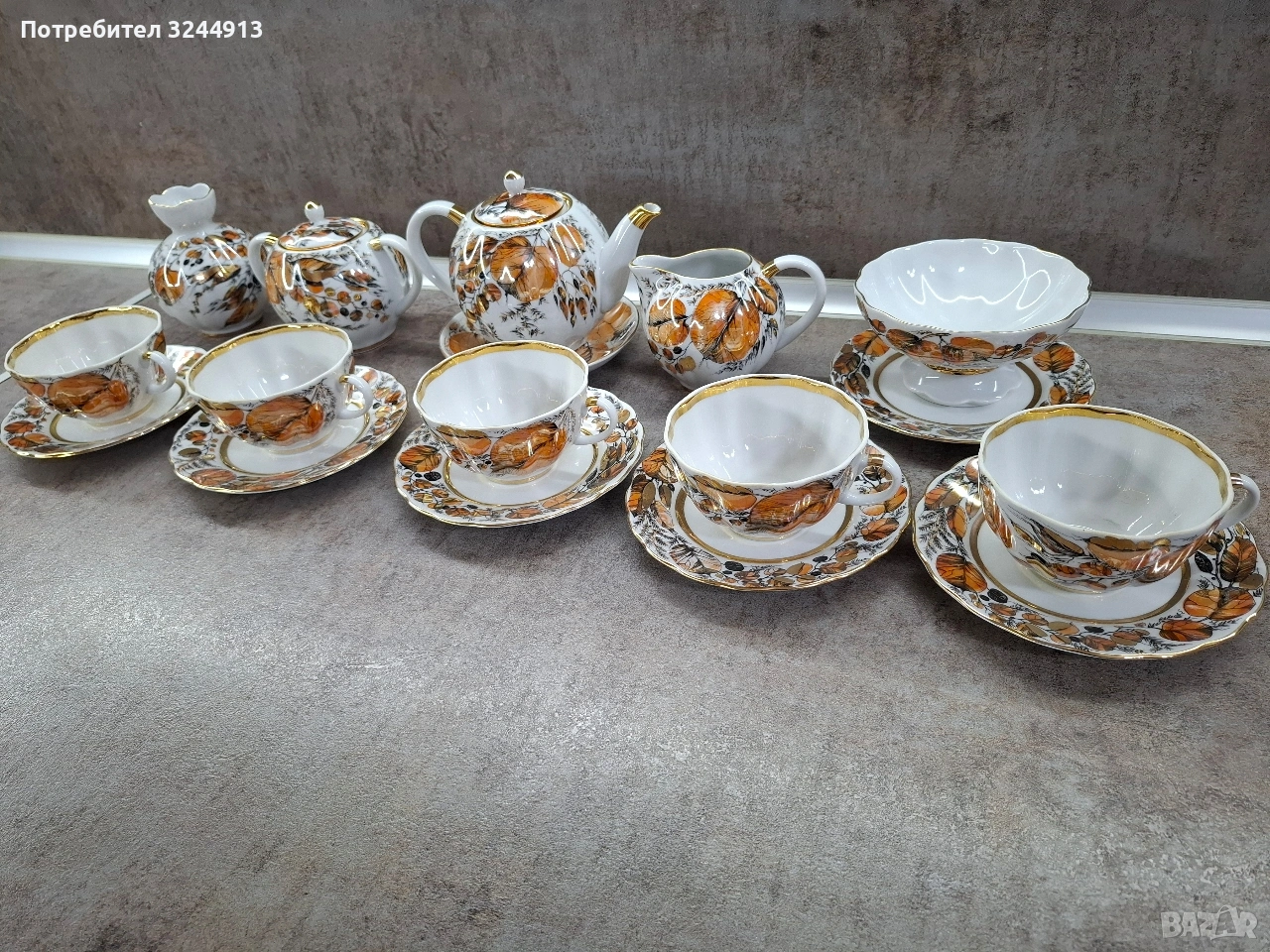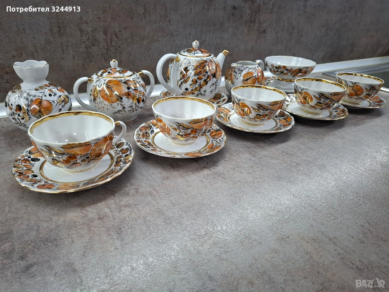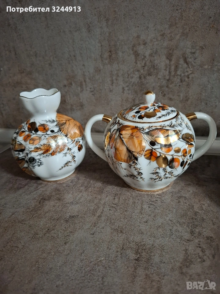 Изключително рядък Руски порцеланов чаен сервиз ЛФЗ ,, Мой сад" ( или познат като ,, Золотая осень") - рядкост като вид, и особено като състояние. Сервиза е стоял единствено в скрина за окраса , без изтриване на перлената боя и златото.По дъното на предметите - плътен златен кант, червено клеймо на дъното виж снимките. Съдържа: 5 чашки с форма ,,лале" 220мл. Чайник, Захарница, Латиера, Ваза, Бонбониера на столче. Цена 400€ . Изпращам с ЕКОНТ преглед . Моля разгледайте и другите ми предложения.